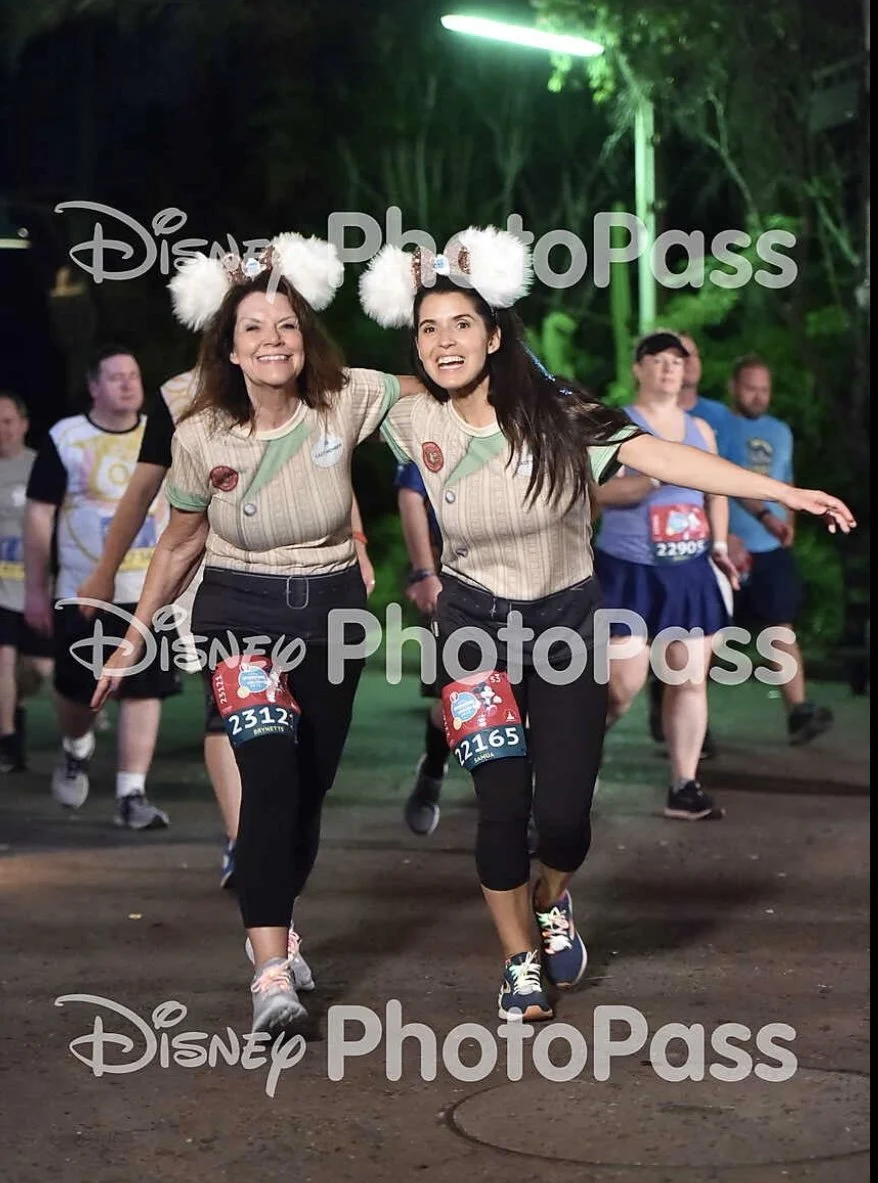 Two women wearing Mickey Mouse ear headbands and themed shirts are running at a night race event, smiling and holding arms around each other, with other runners behind them.