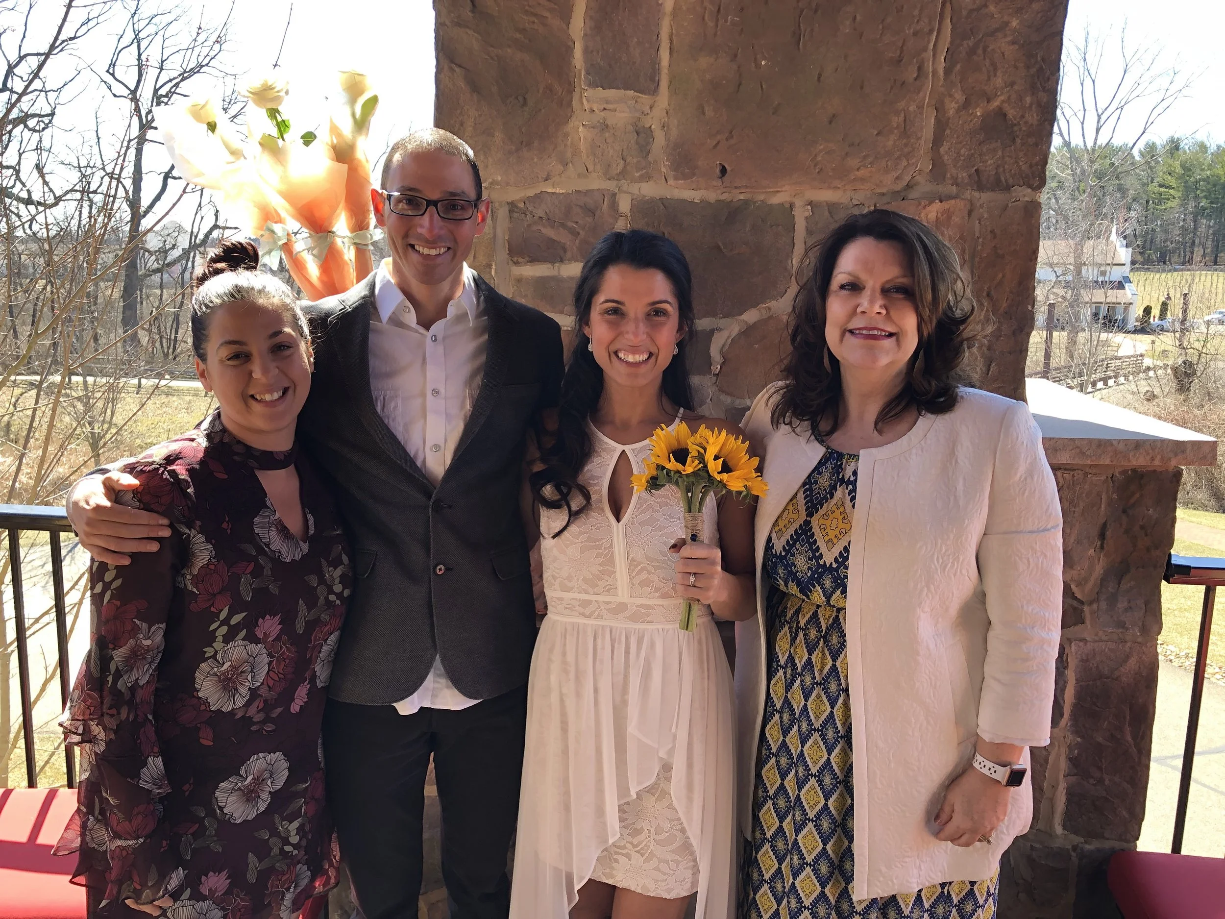 Group of five smiling people standing outdoors near a brick fireplace, with trees and building visible in the background, during daytime. One woman holds a bouquet of yellow sunflowers.