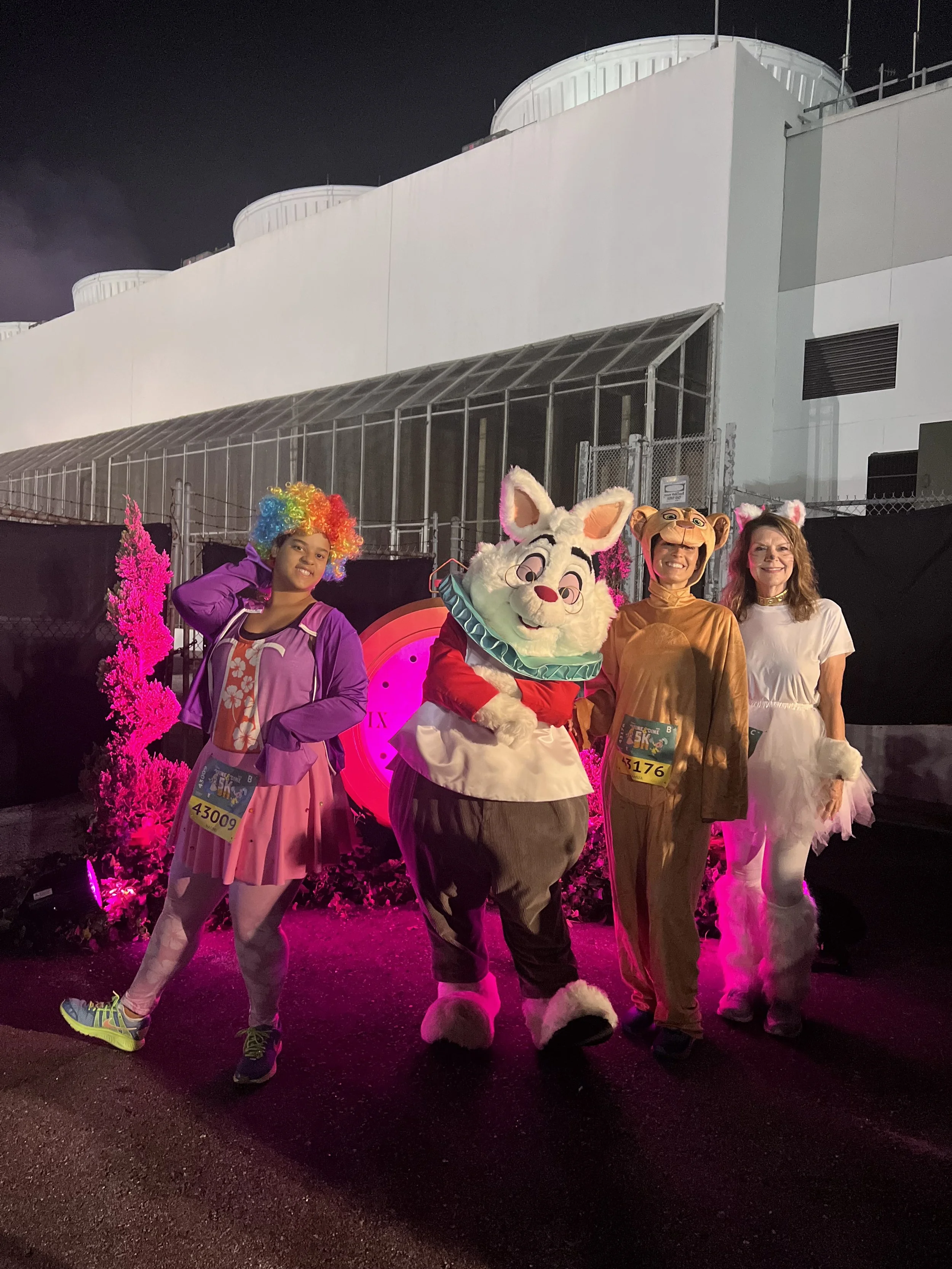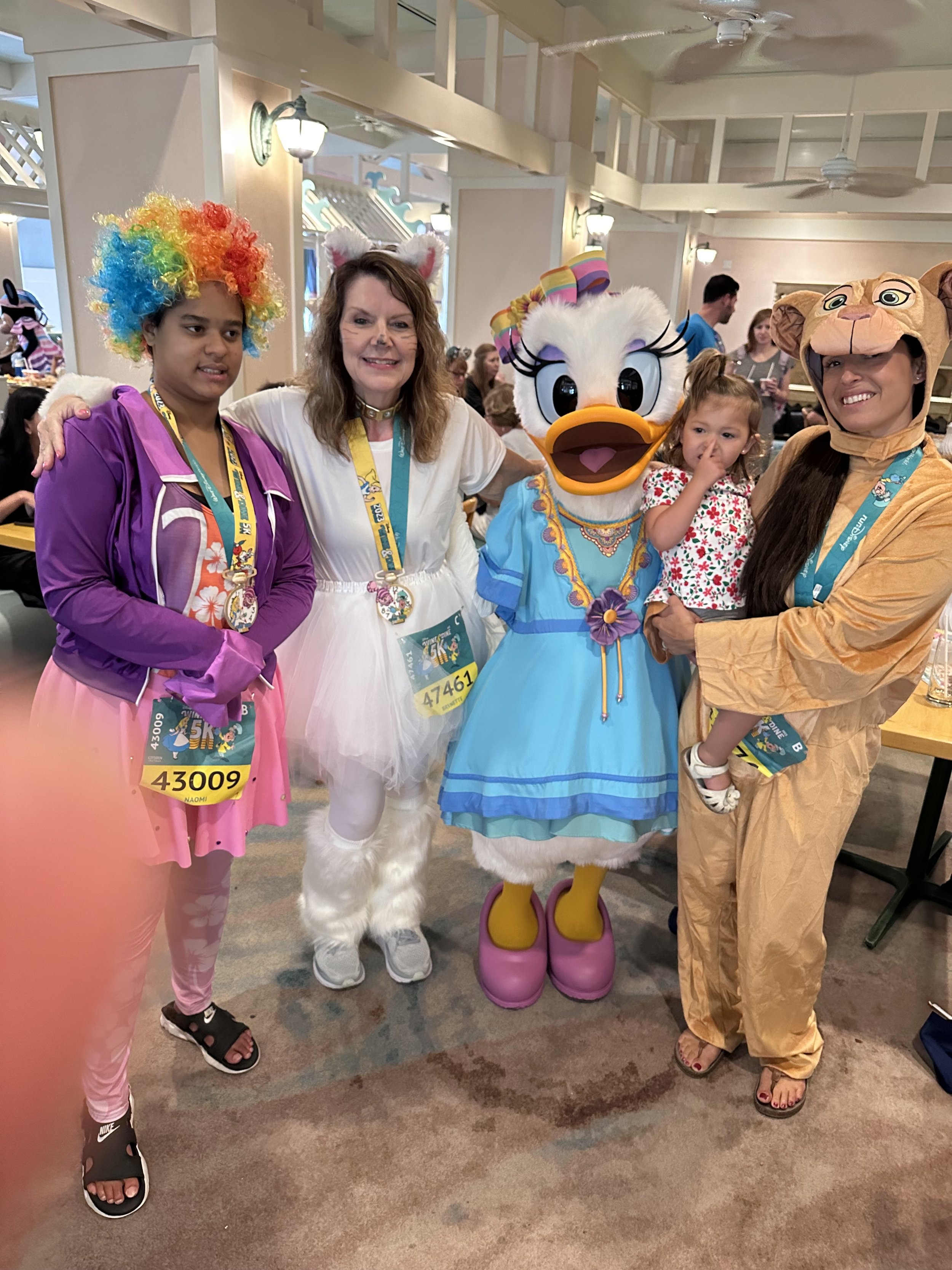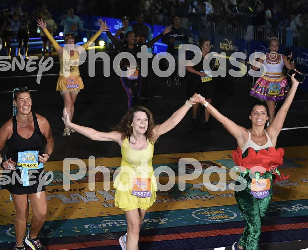 Women celebrating at a Disney-themed event, holding hands in victory, with others in colorful costumes and race bibs, inside a venue with a Disney race banner on the floor.