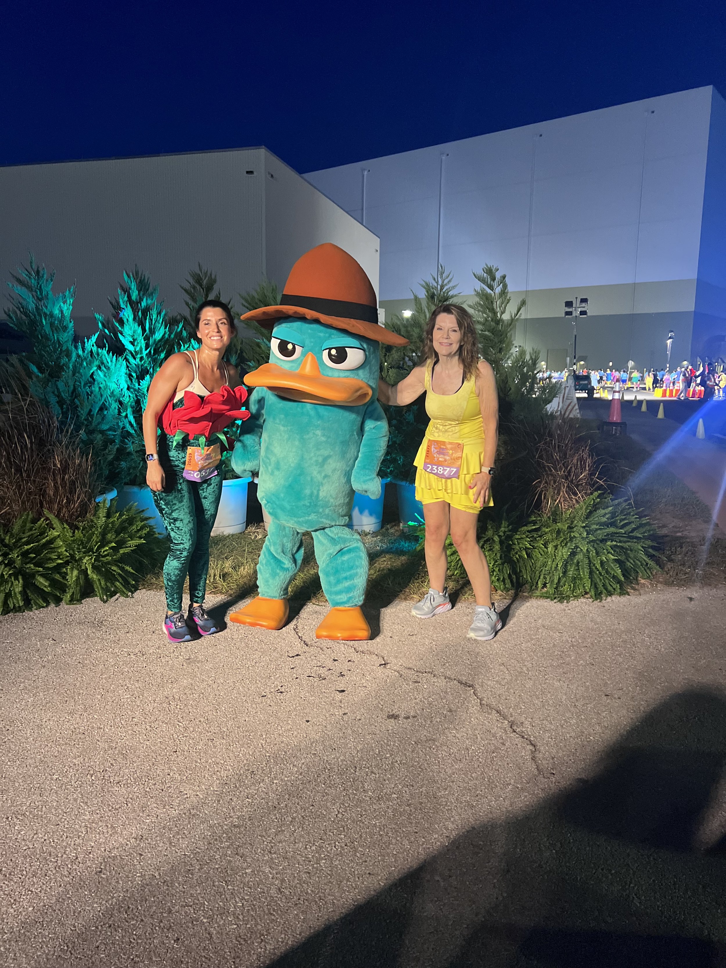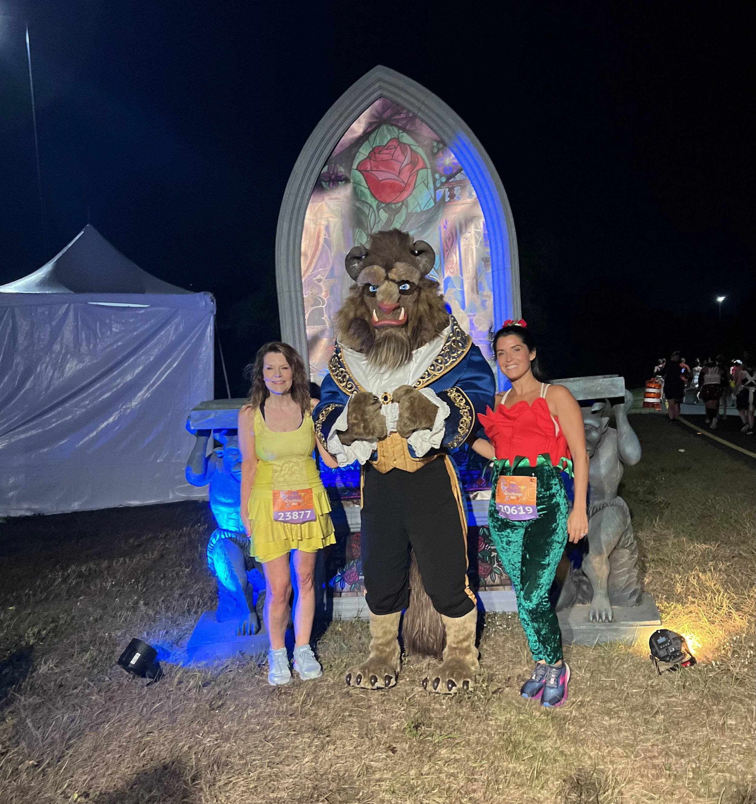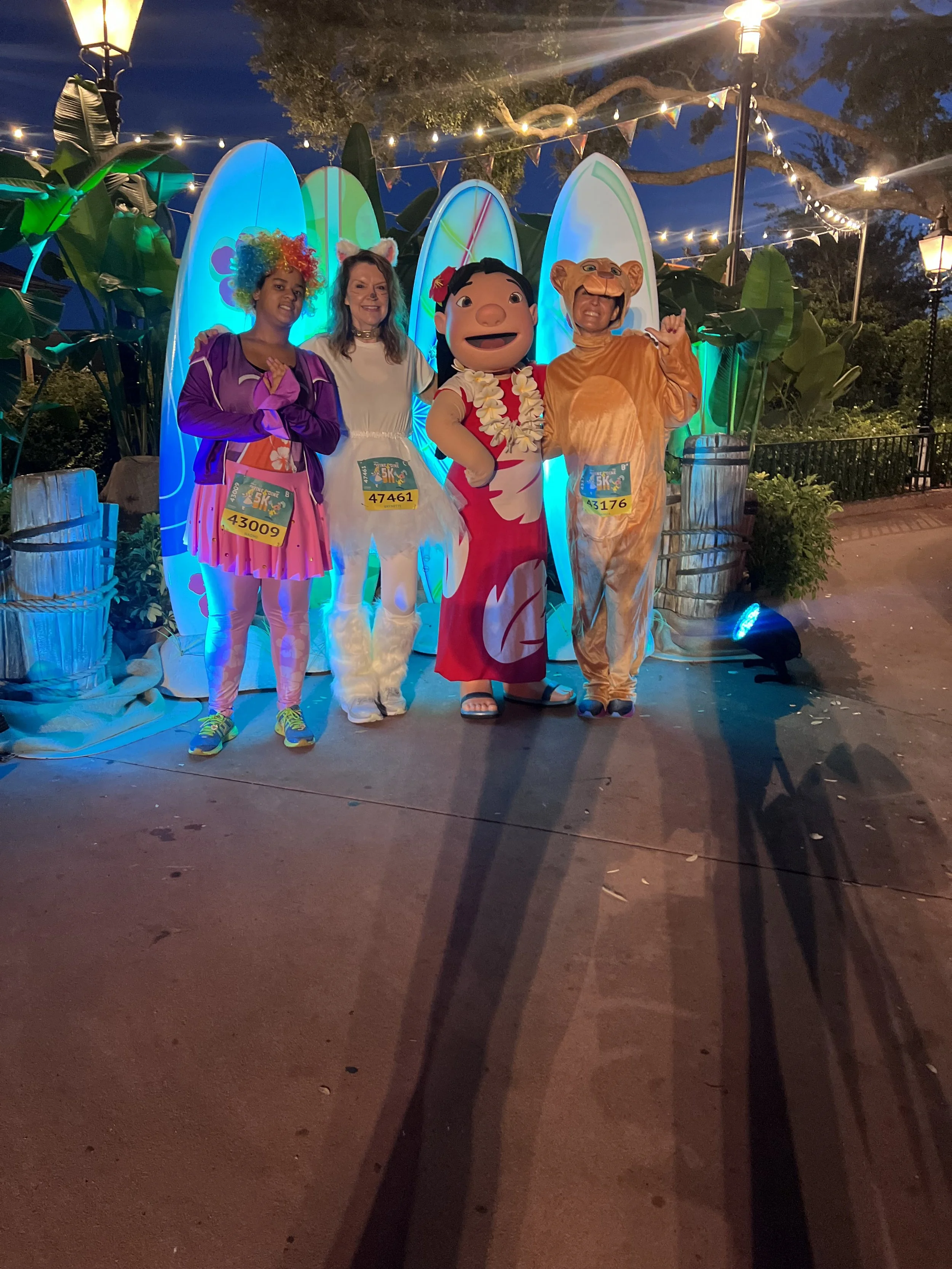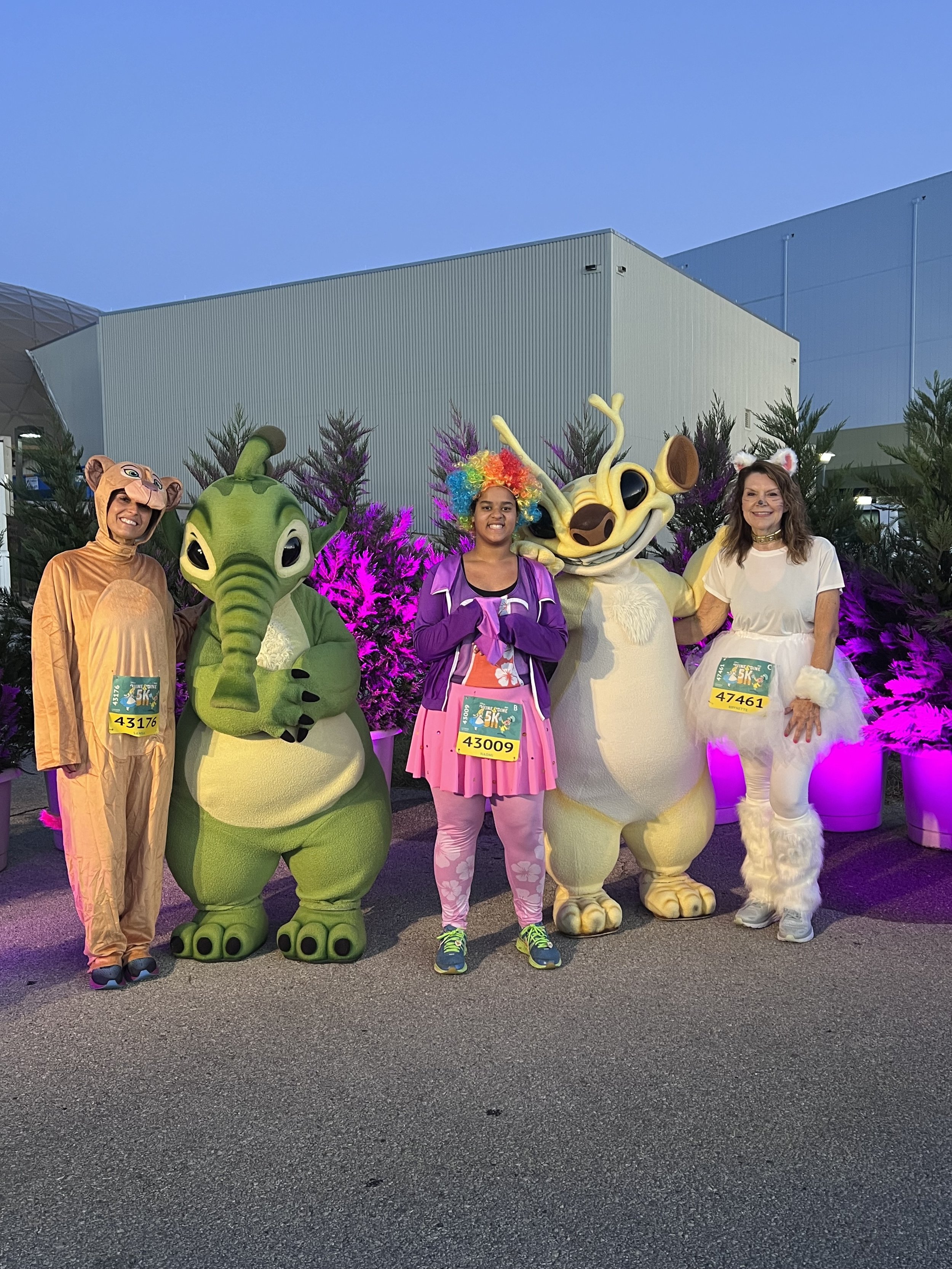 Women celebrating at a Disney-themed event, holding hands in victory, with others in colorful costumes and race bibs, inside a venue with a Disney race banner on the floor.