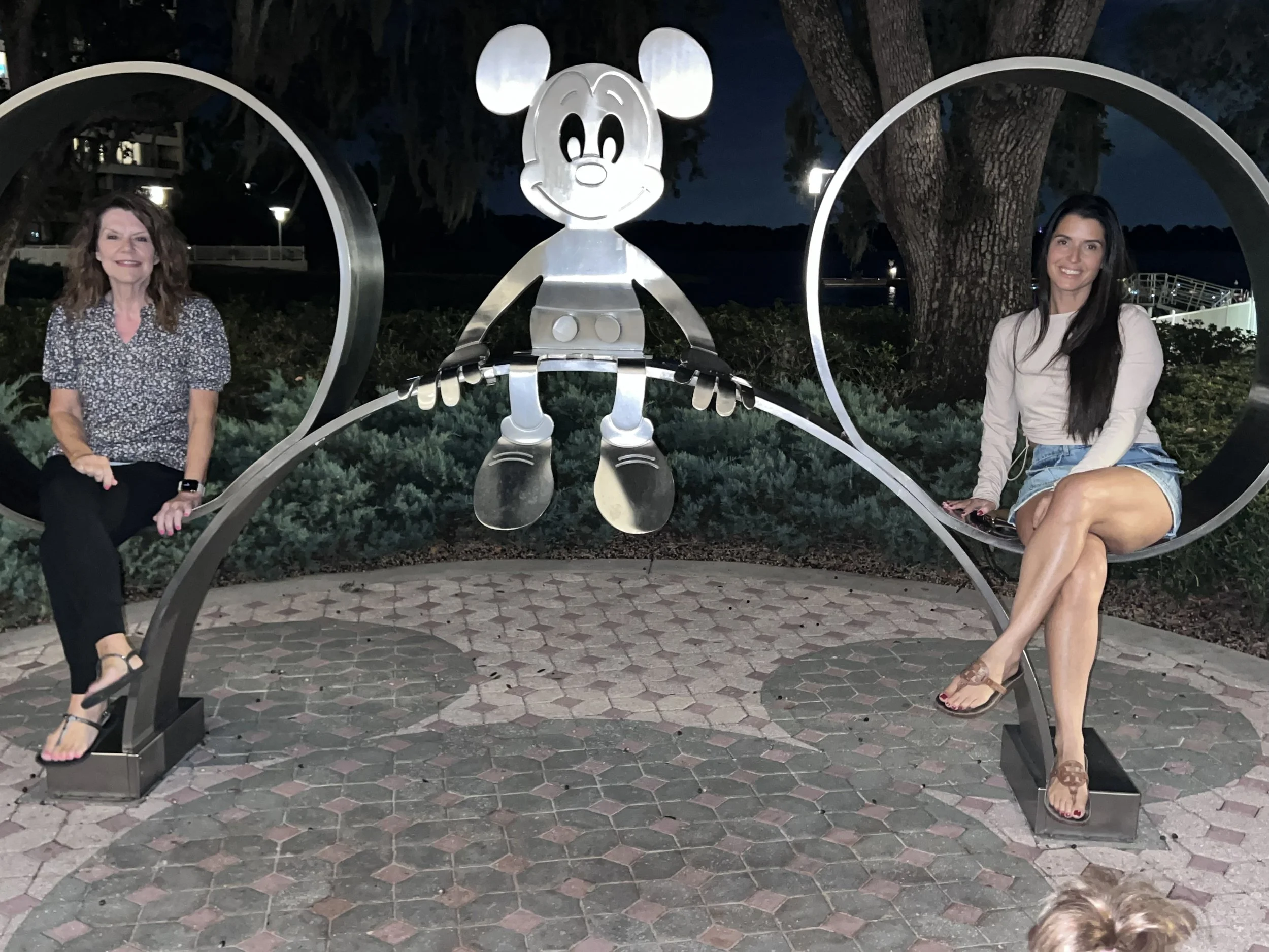 Two women sitting on loops of a large sculpture of Mickey Mouse, night scene in the background.