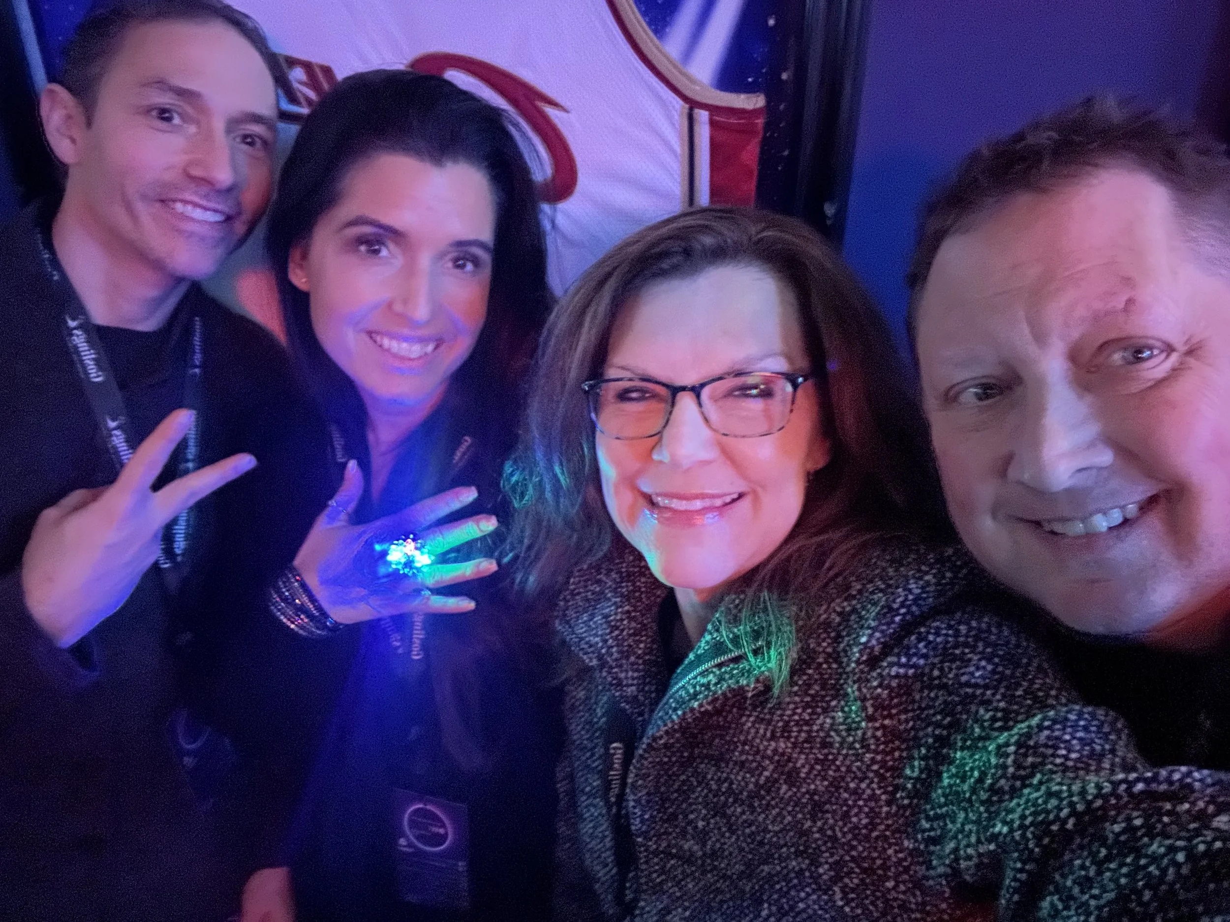 Five people taking a selfie at an event, smiling and making peace signs, with a colorful background and purple lighting.