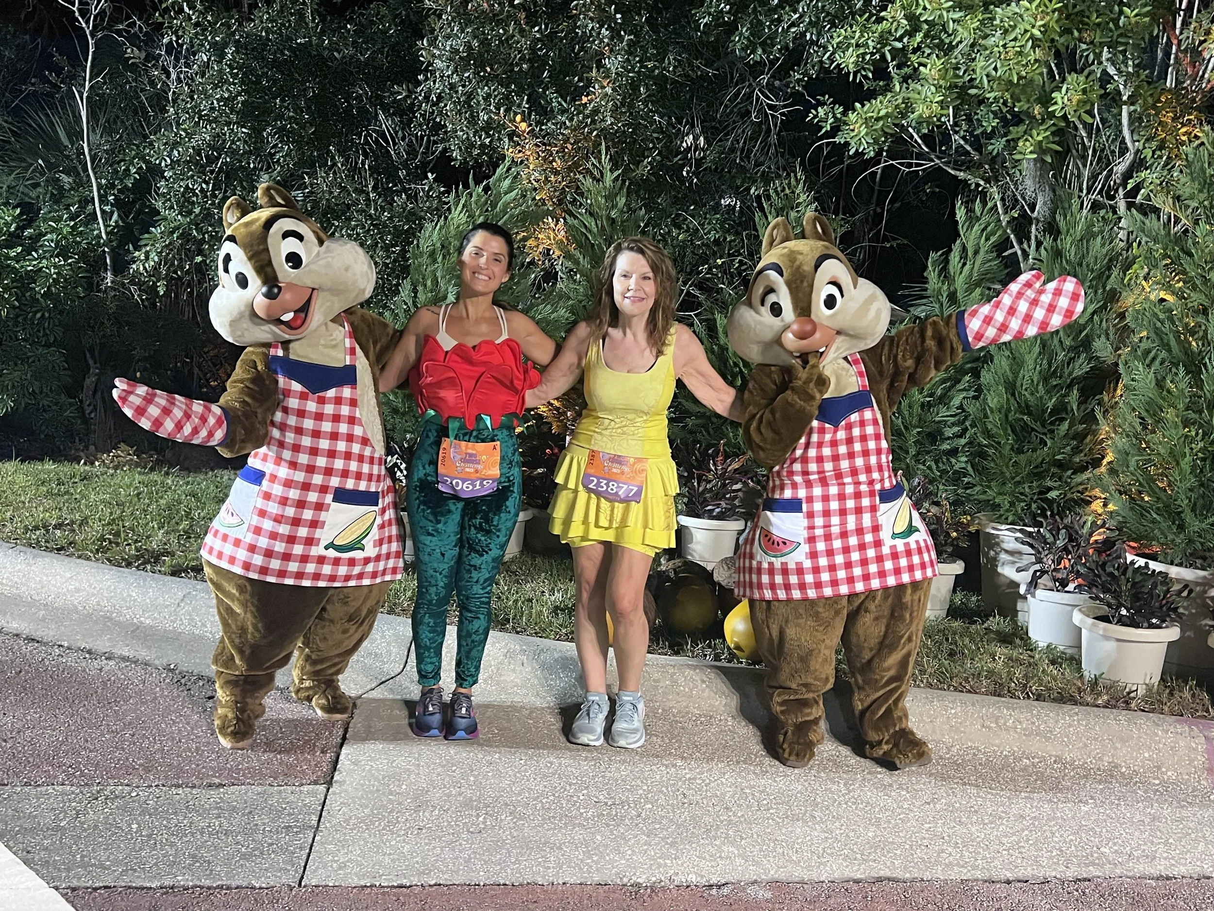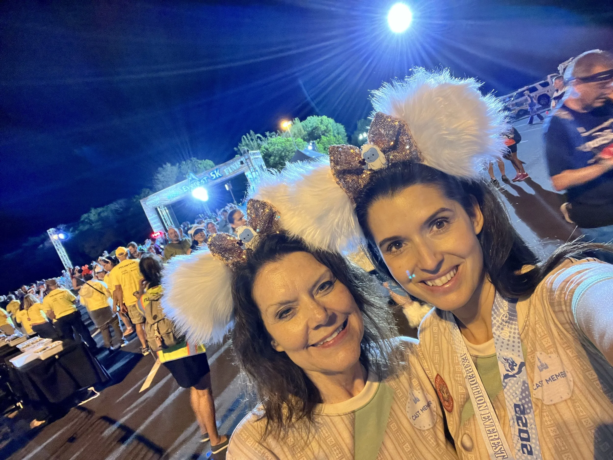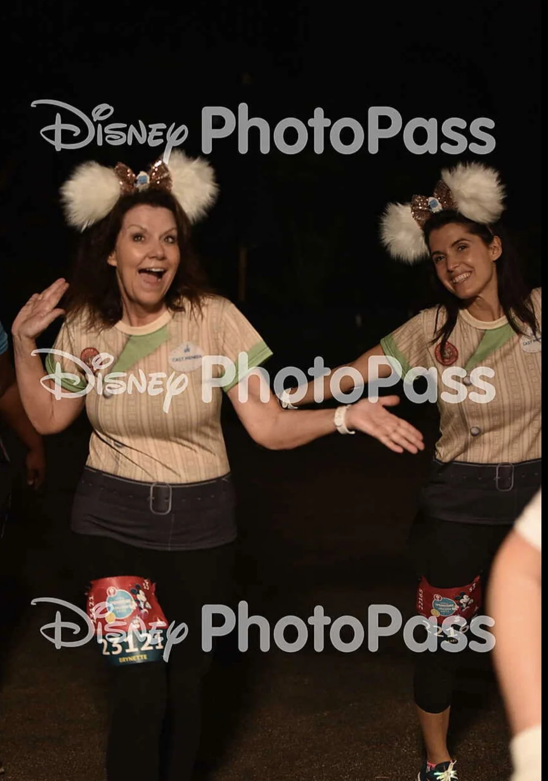 Two women wearing Disney-themed headbands with fluffy pom-poms and Mickey Mouse ears, smiling and posing at night. They are dressed in themed costumes with name badges and Disney logo patches, and are participating in a Disney event or race.