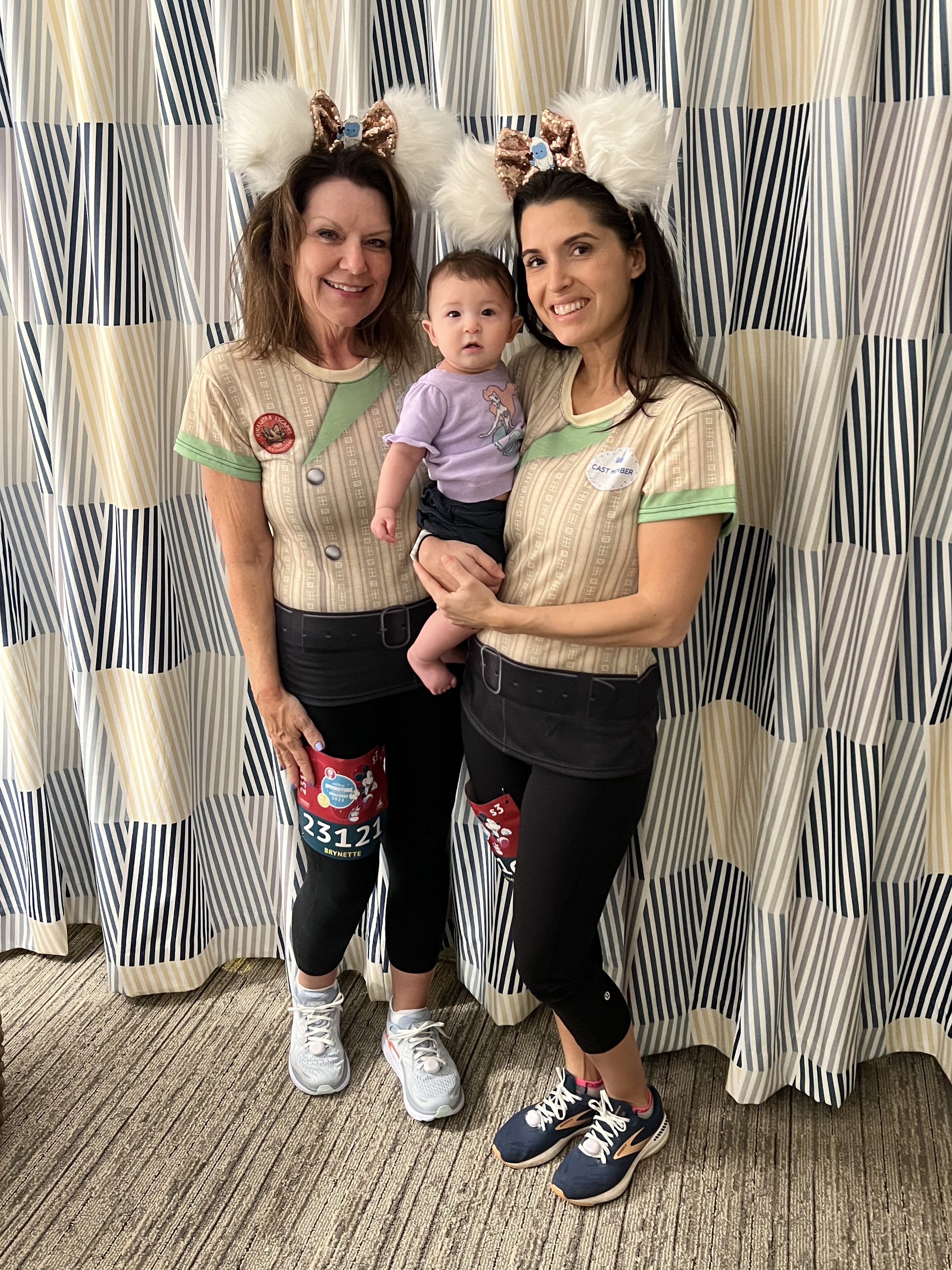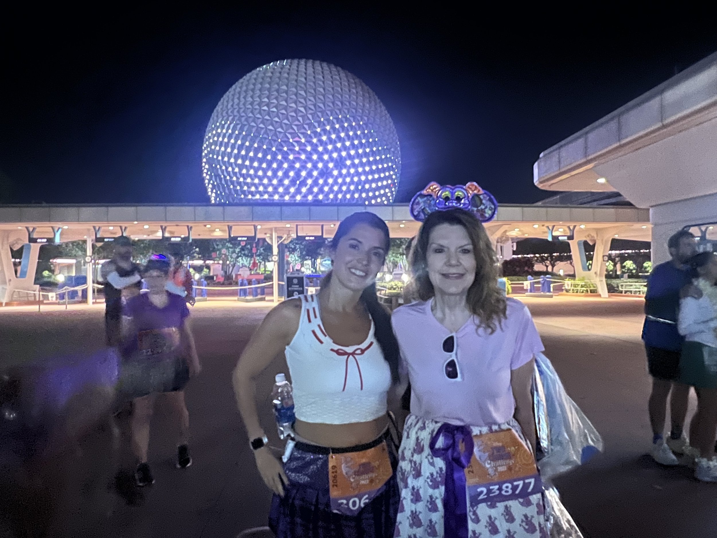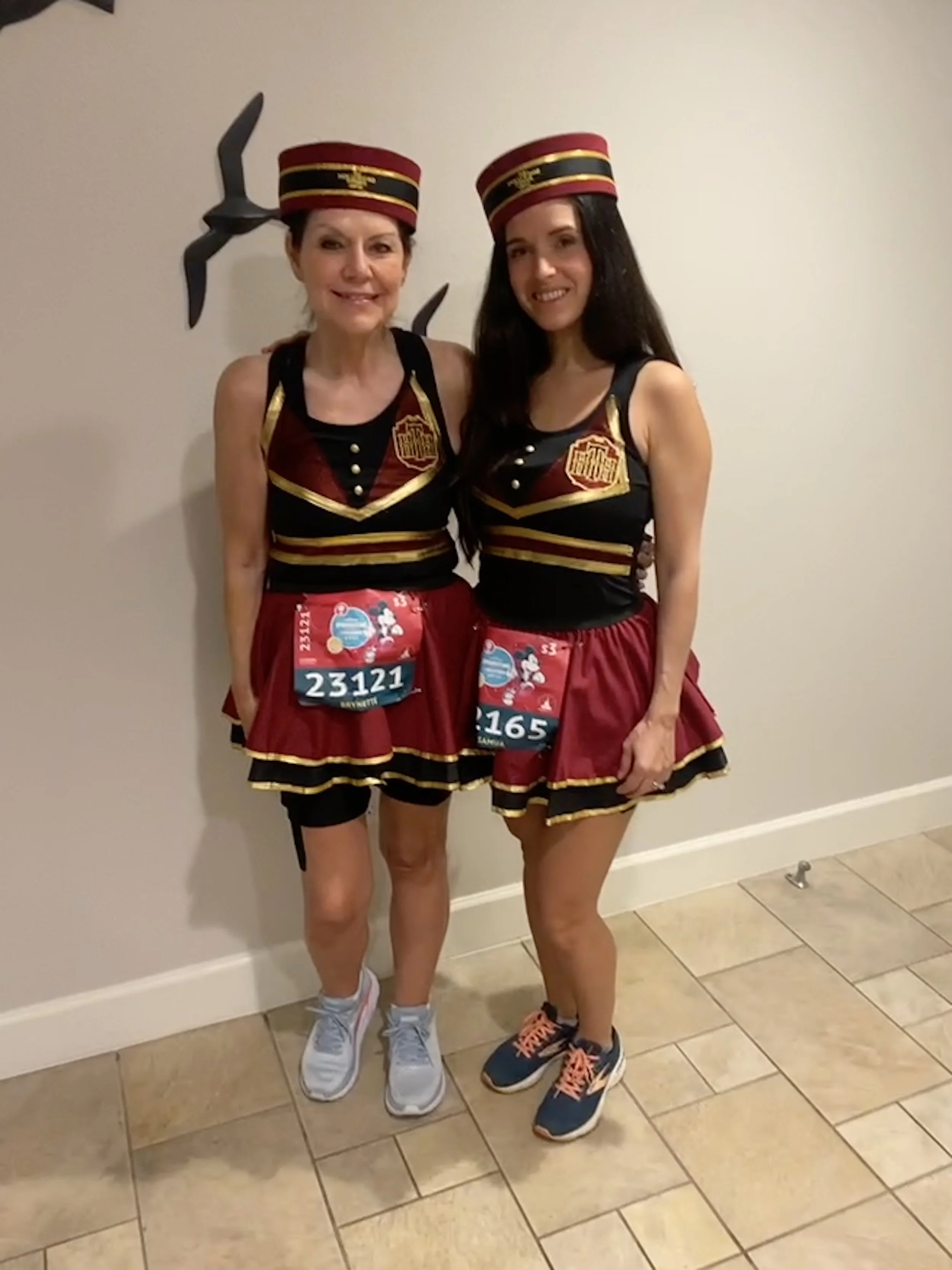 Two women wearing Disney-themed headbands with fluffy pom-poms and Mickey Mouse ears, smiling and posing at night. They are dressed in themed costumes with name badges and Disney logo patches, and are participating in a Disney event or race.