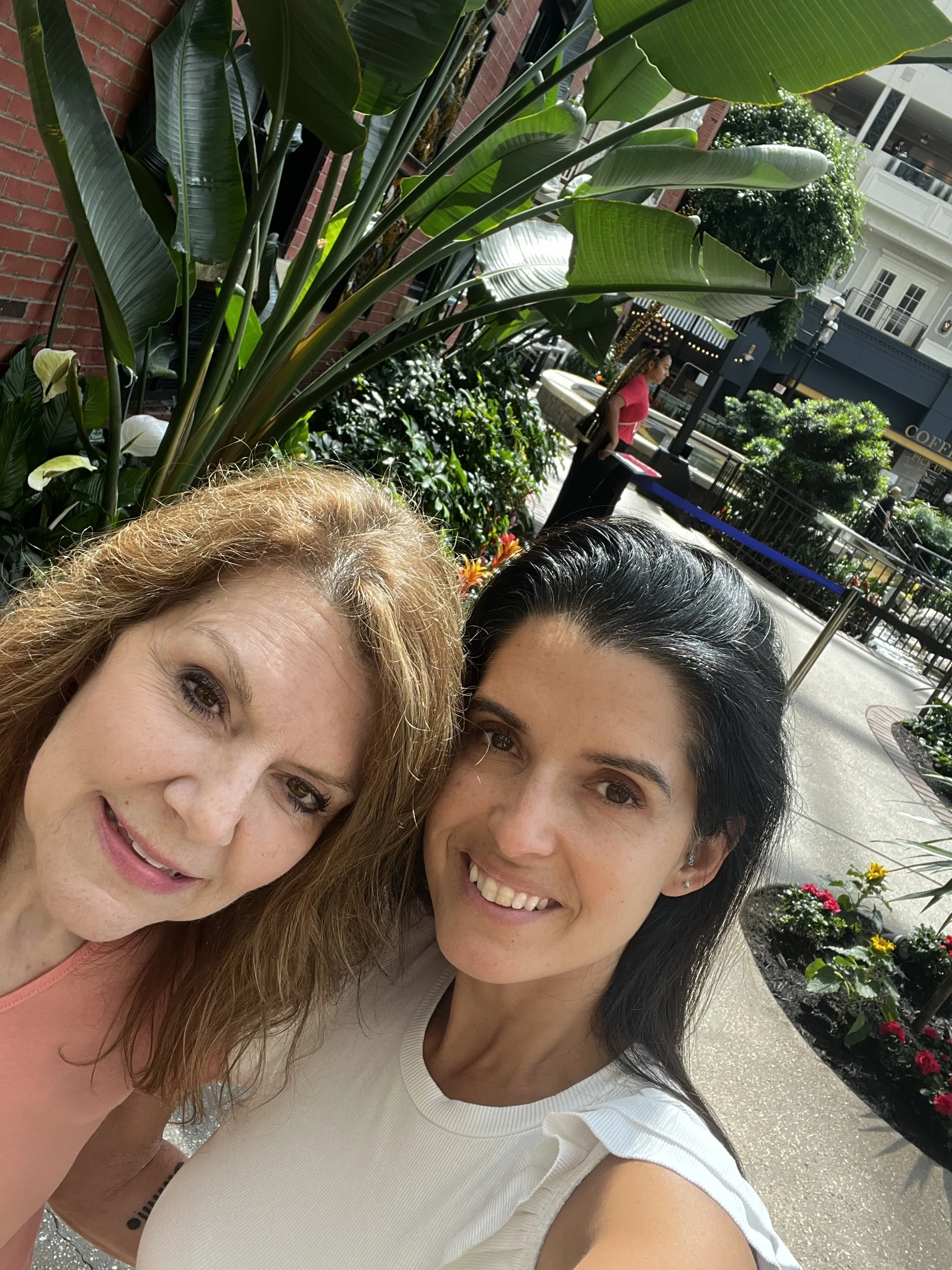 Two women taking a selfie outdoors in a shopping district with plants and flowers around them.