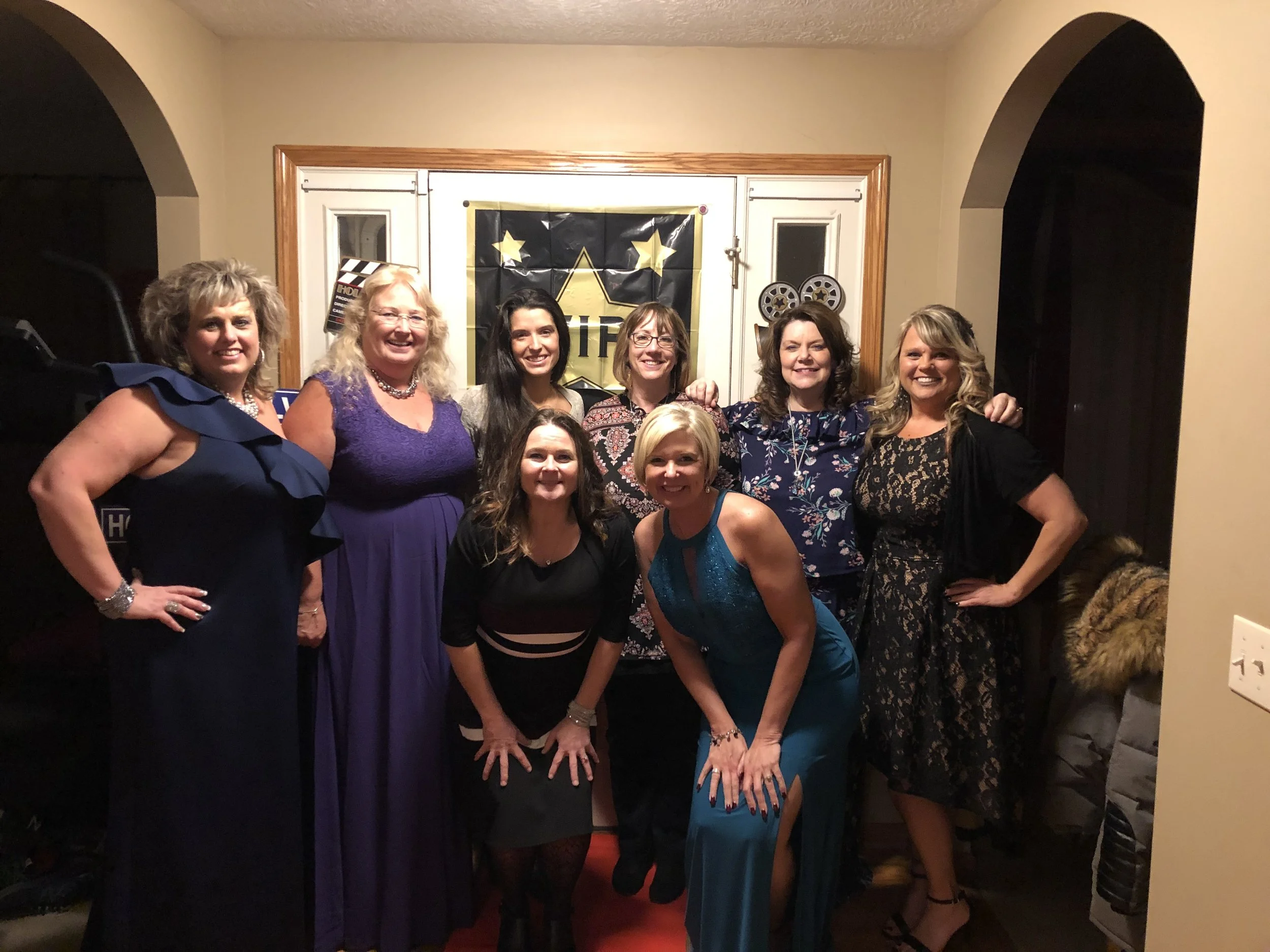 Group of nine women posing together indoors at a celebration or party, with a star-themed banner in the background.
