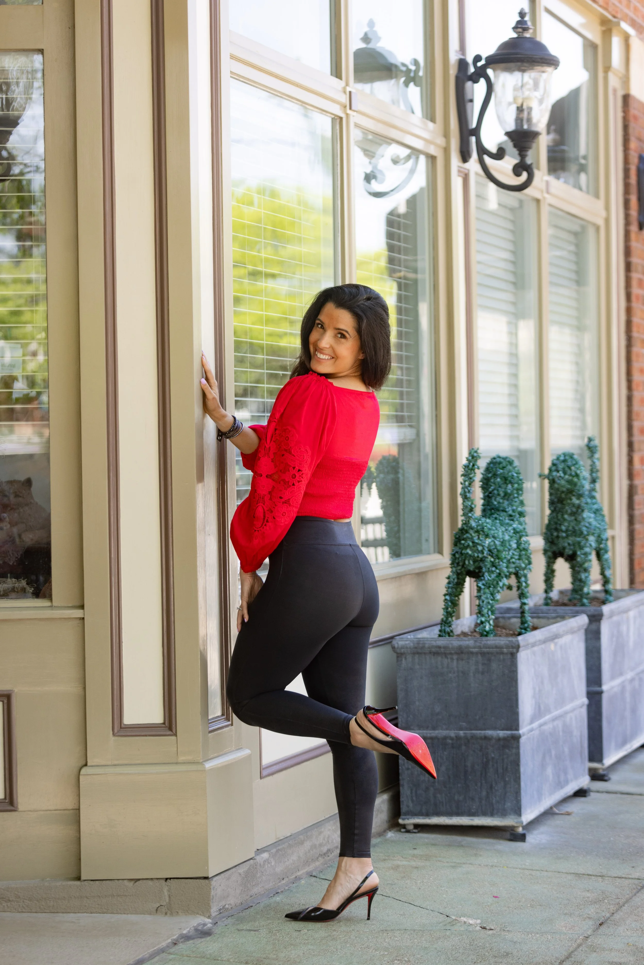 A woman with long dark hair smiling and posing outside a building with large windows and decorative planters containing small topiary trees. She is wearing a bright red blouse, black leggings, and black and red high heels.