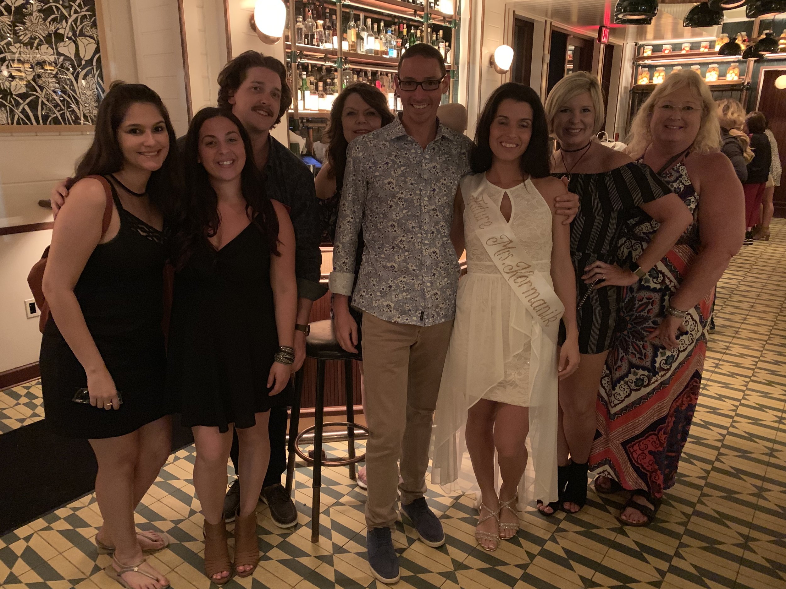 Group of eight people celebrating a wedding at a restaurant or bar, with a bar in the background and a patterned floor.