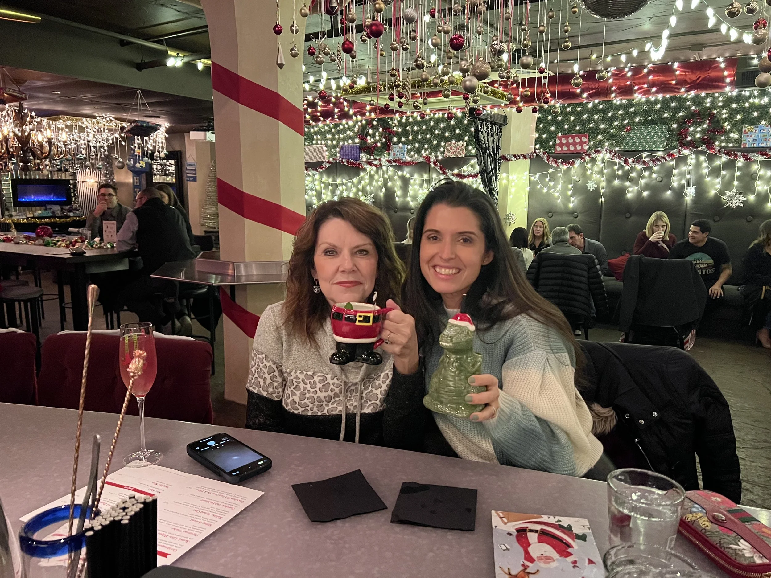 Two women sitting at a festive Christmas-themed restaurant, smiling and holding holiday mugs, with Christmas decorations and others in the background.