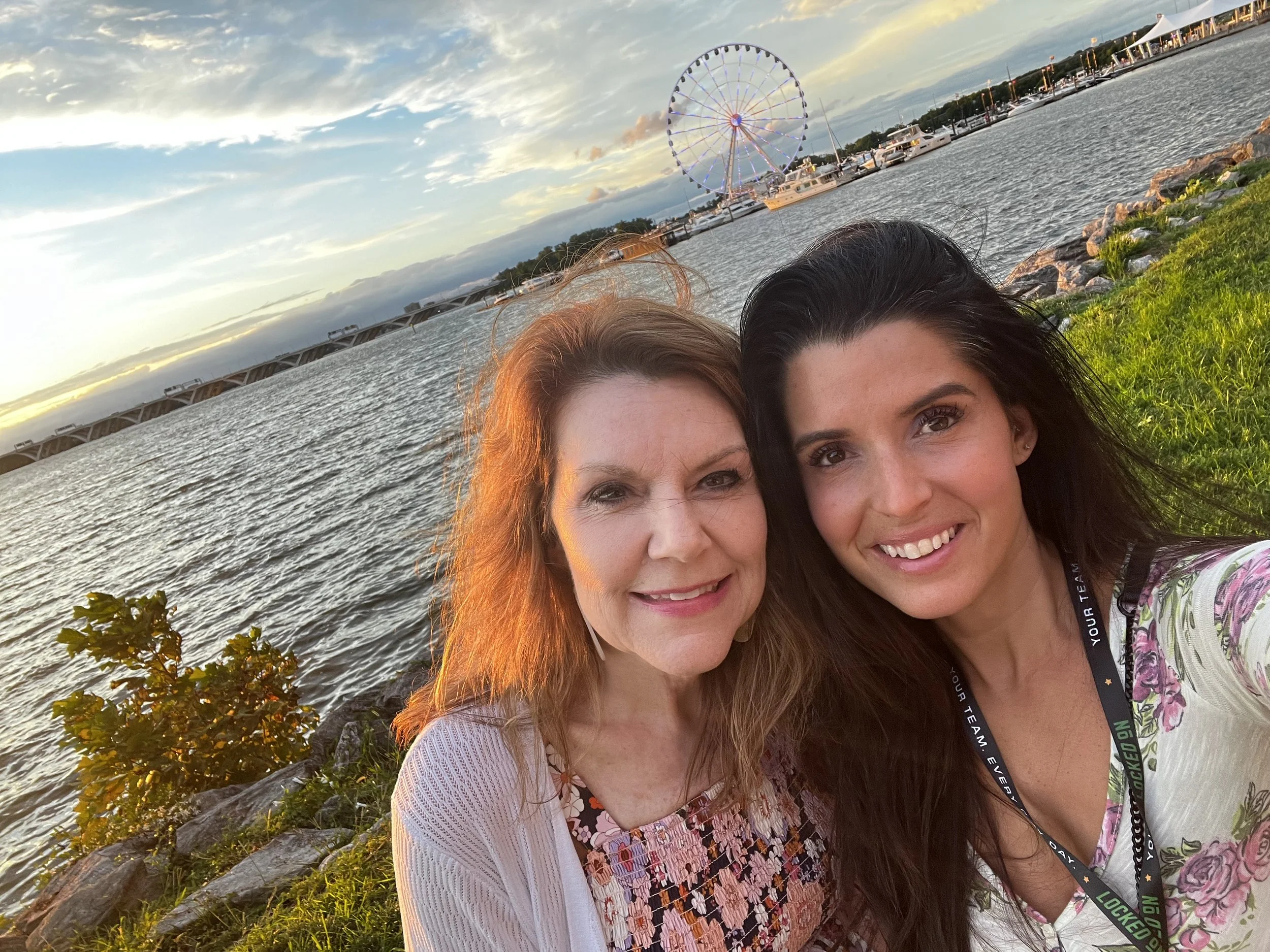 Two women smiling at the camera while sitting by a lakeside at sunset with a Ferris wheel and boats in the background.