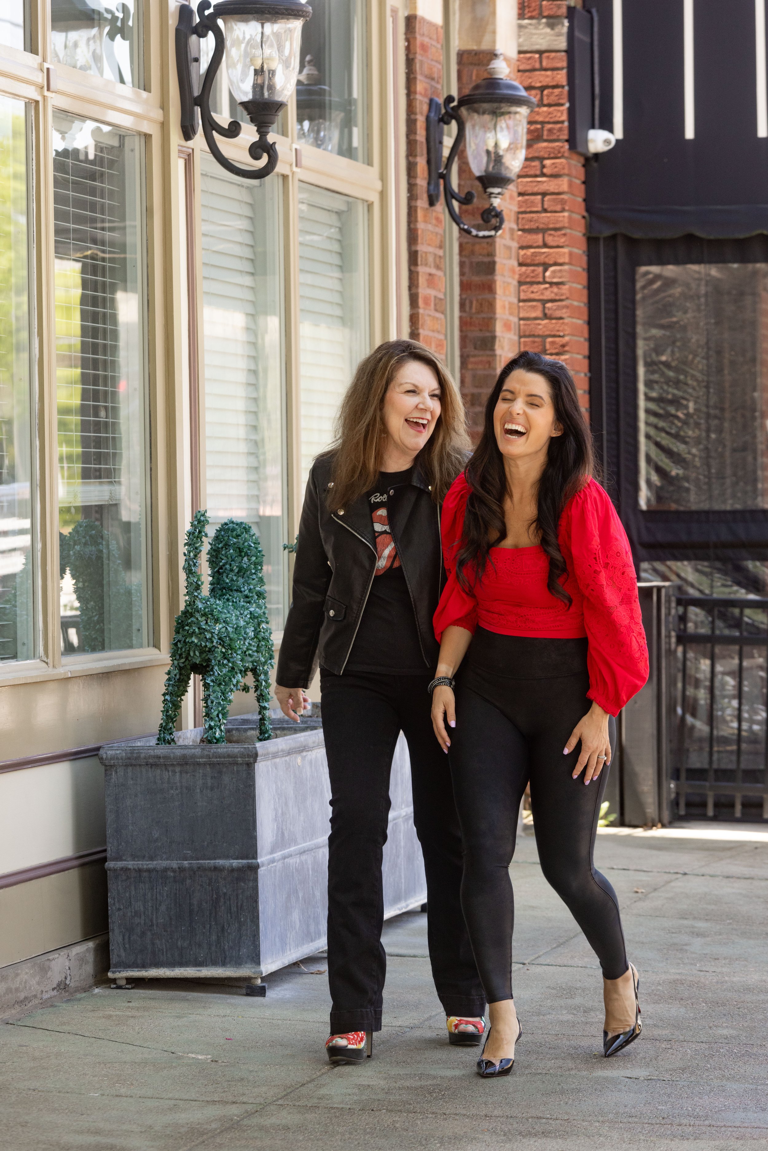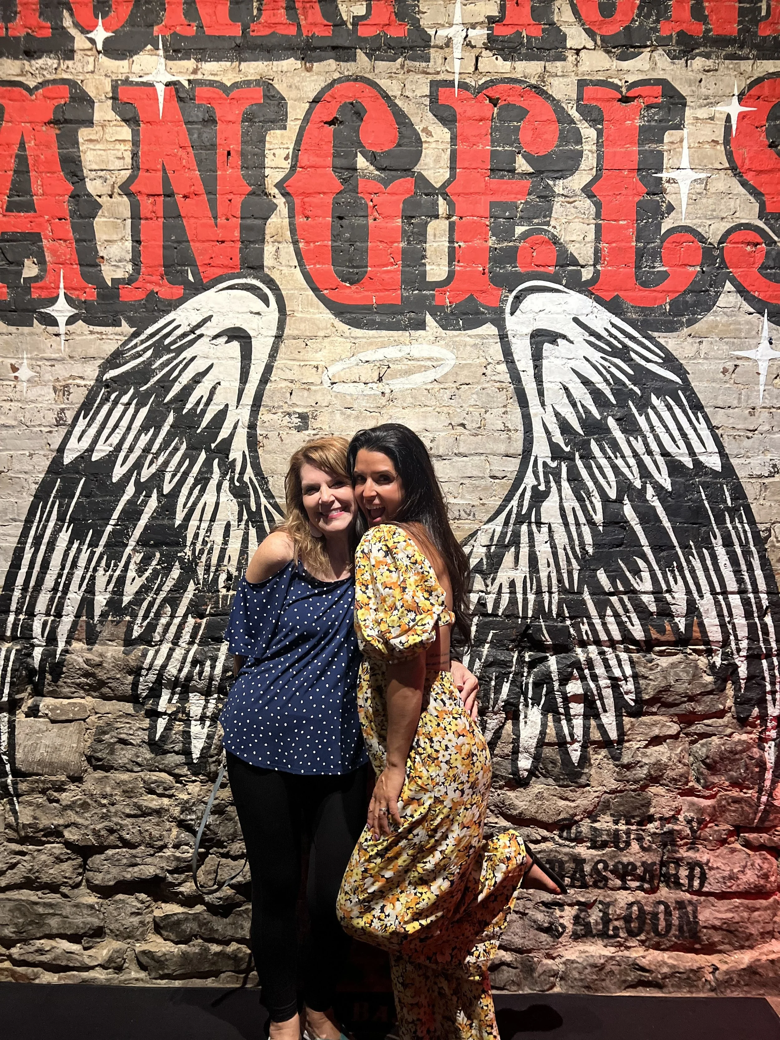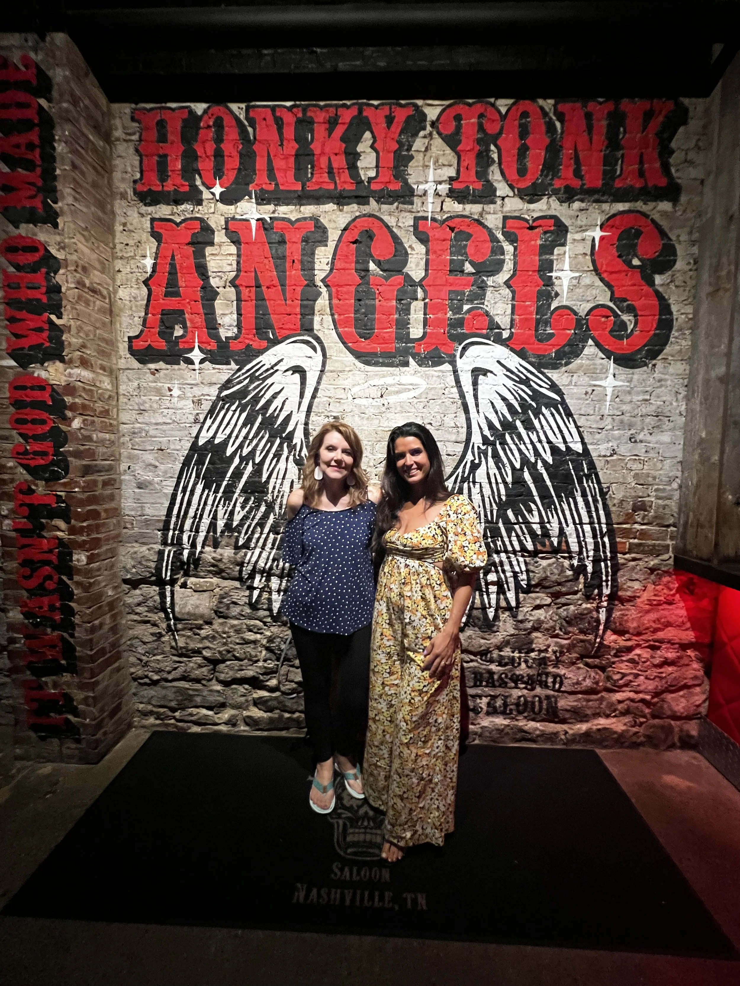 Two women standing in front of a brick wall with a large mural that says "Honky Tonk Angels" and has angel wings painted on it.