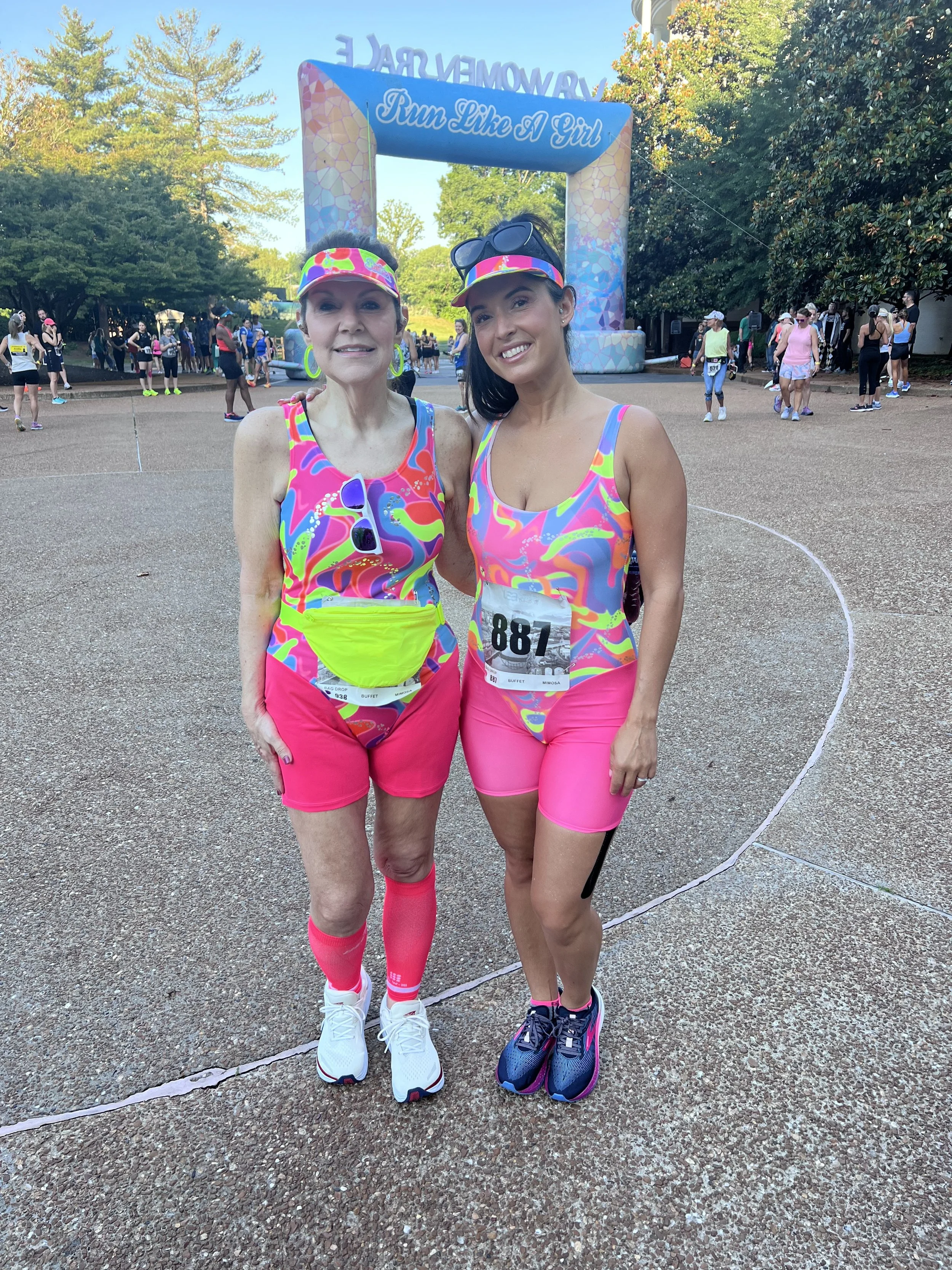Two women in colorful running outfits standing together at a race event, with a large inflatable arch in the background that reads 'Run Like A Girl' and a crowd of runners behind them.