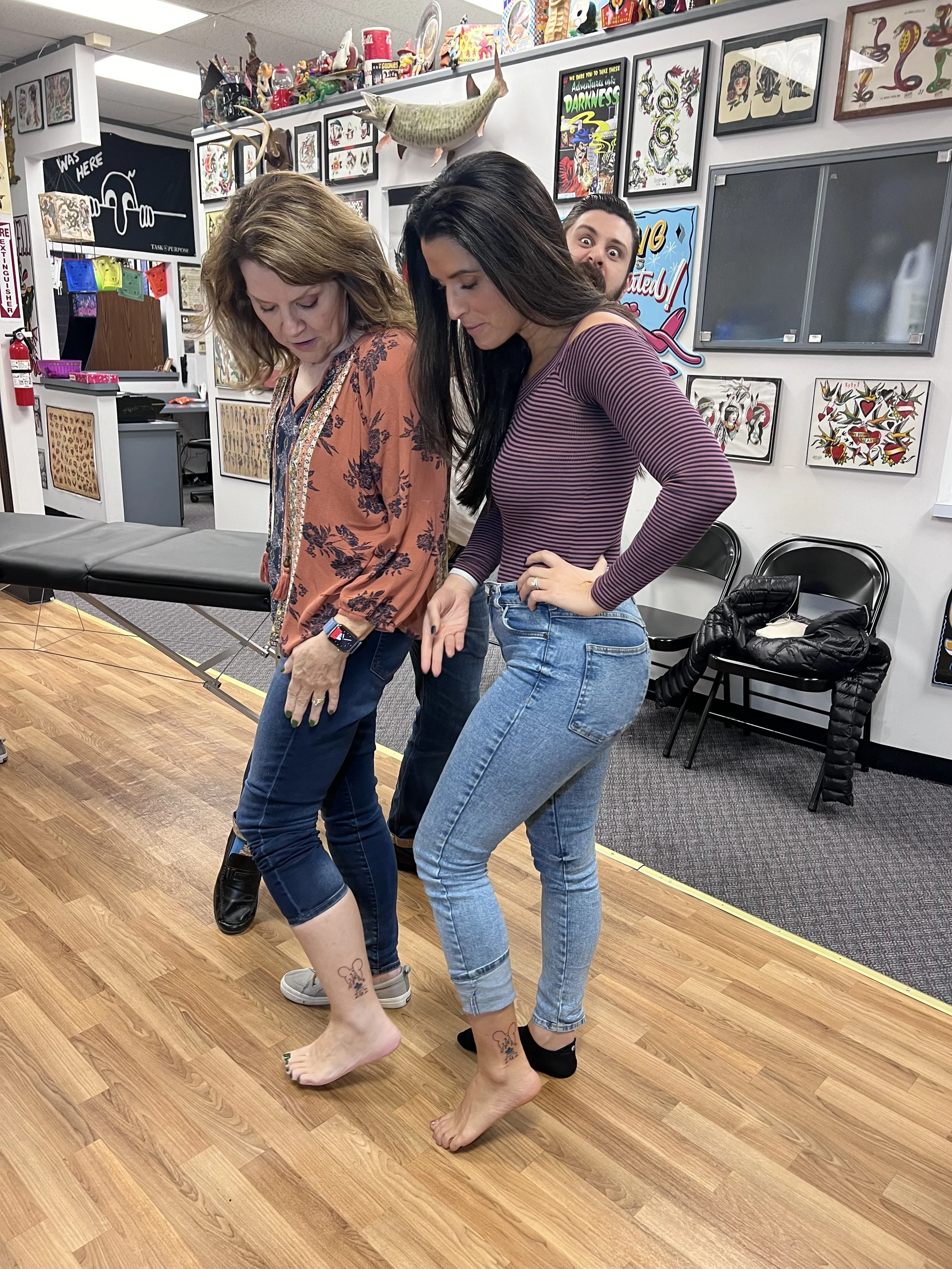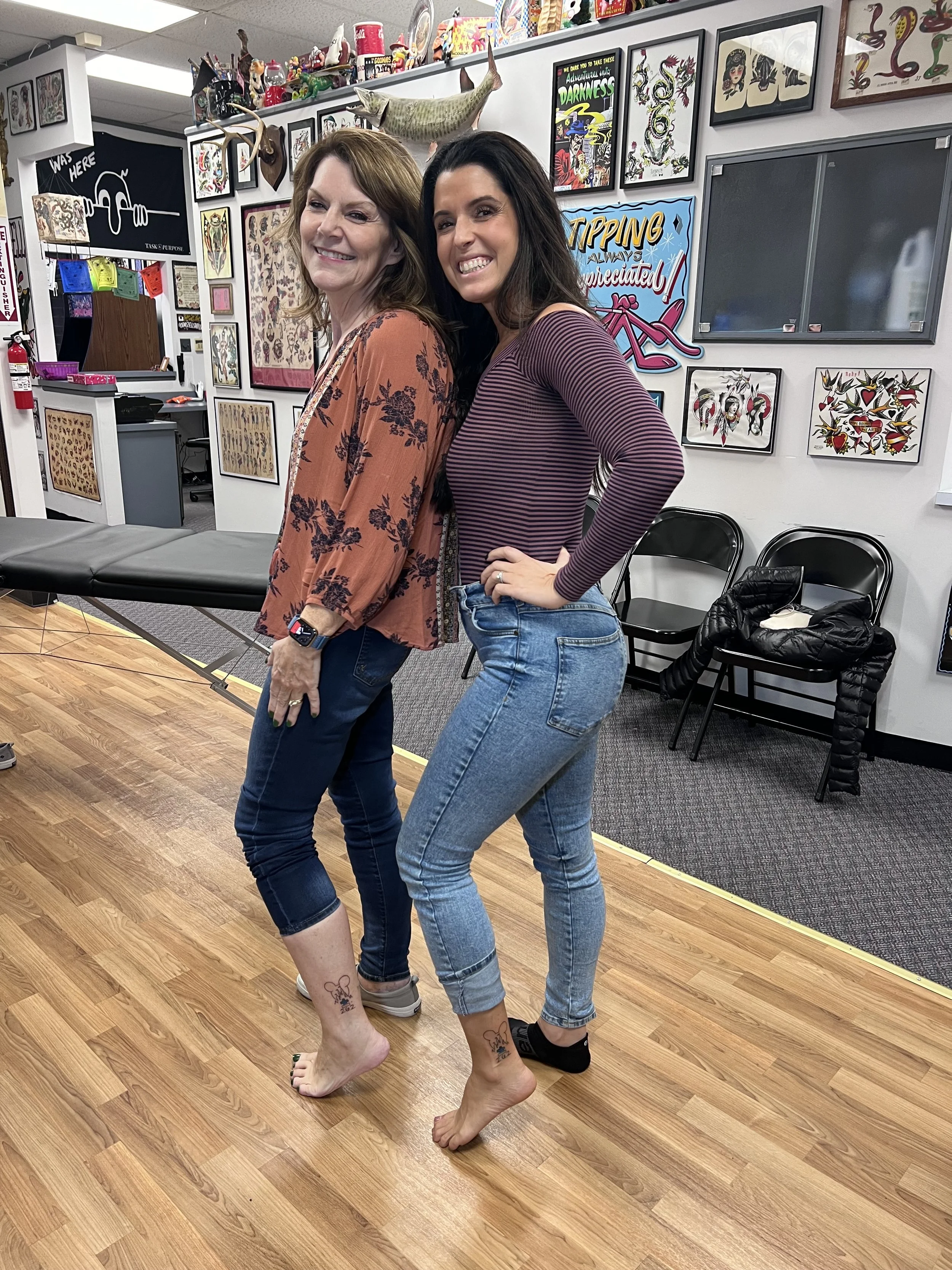 Two women pose indoors, one with brown hair in a floral top and the other with black hair in a striped top. They are barefoot, showing tattoos on their ankles, and stand on a wooden floor with art and posters on the wall behind them.