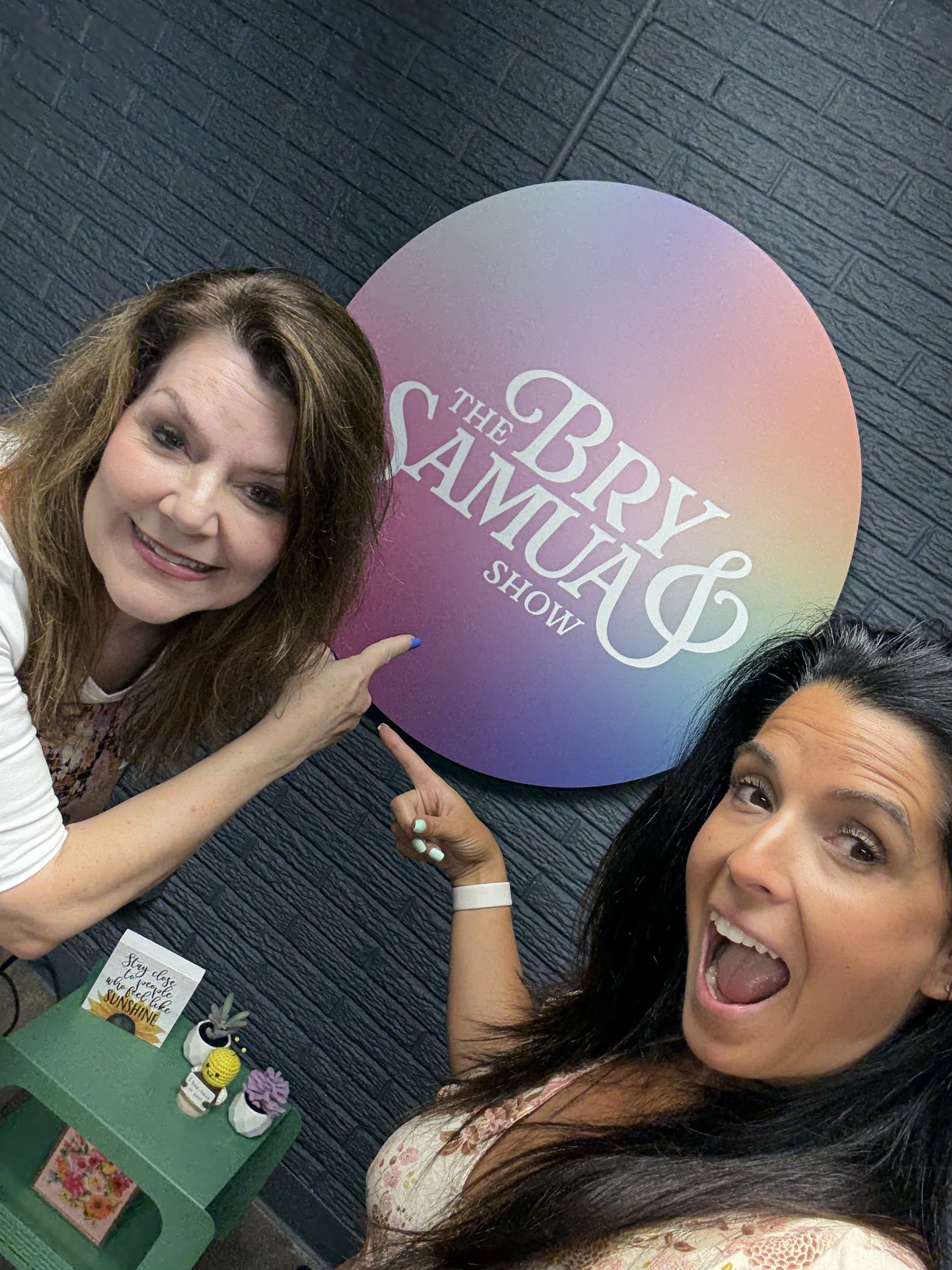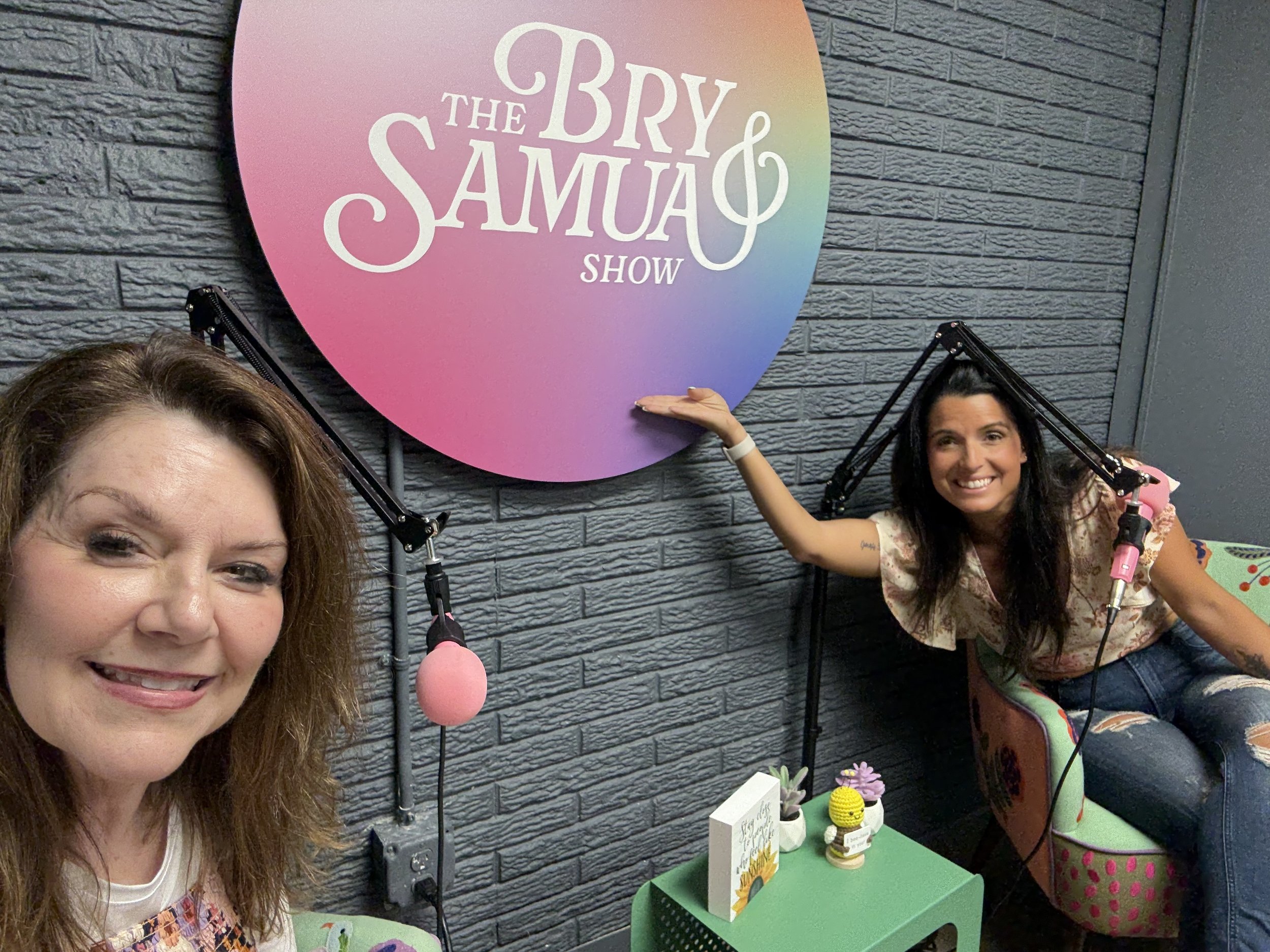 Two women sitting in colorful chairs with microphones, smiling in a studio with a large pink and purple circular sign that reads 'The Bry & Samu Show'.