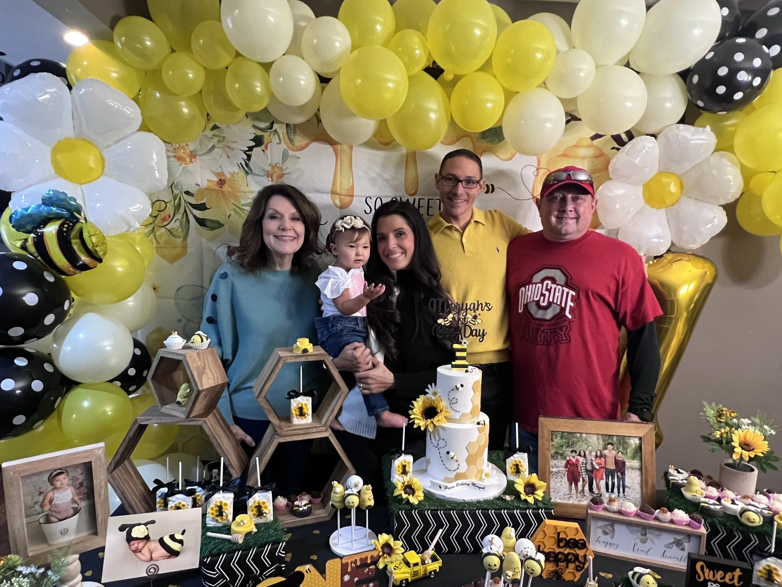 A group of five people, including a young girl, stand in front of yellow, white, black, and gold bee-themed decorations for a celebration, with a honey bee and flower motif, a tiered cake, and framed photos on a decorated table.