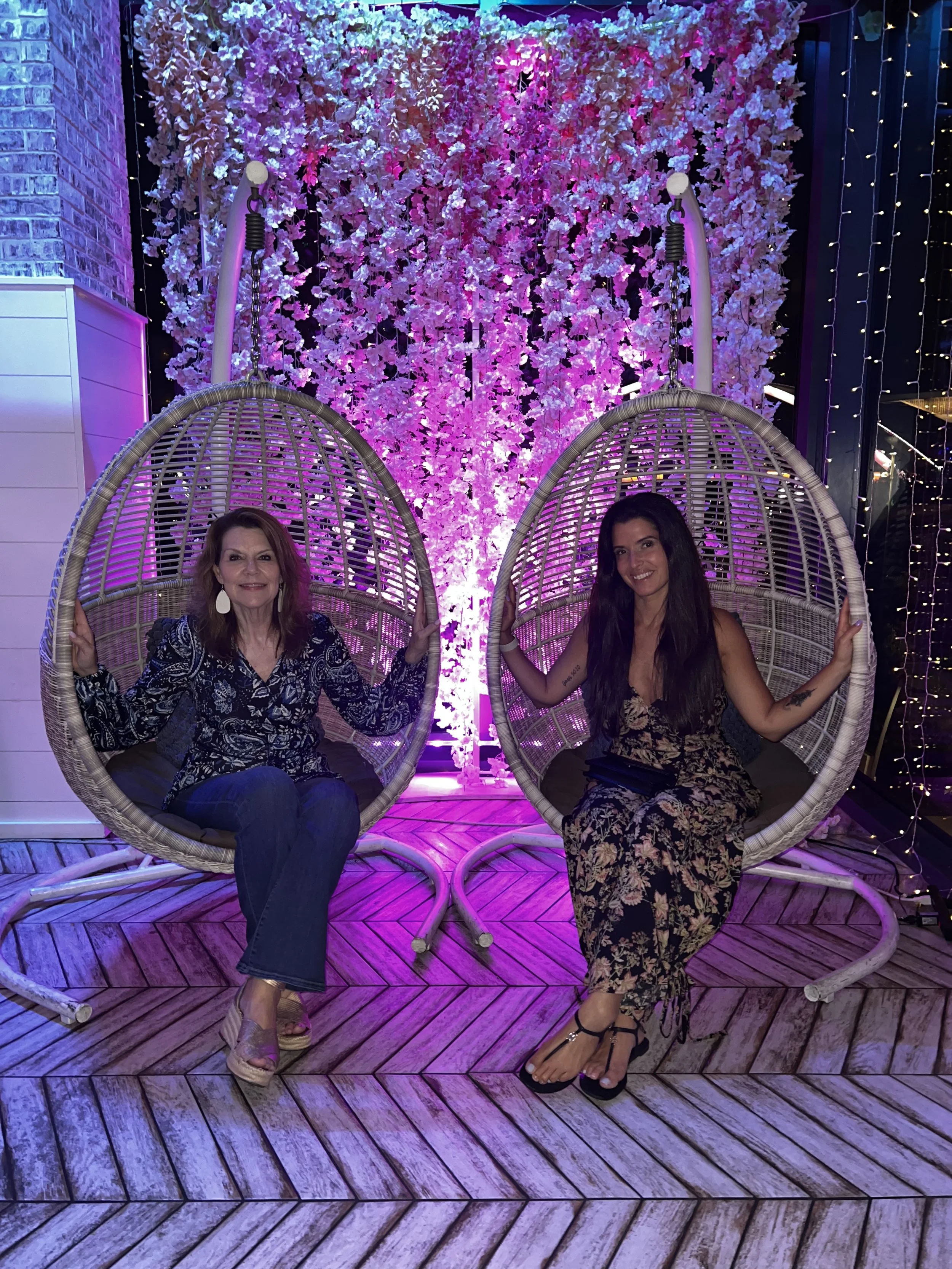 Two women sitting in hanging wicker chairs facing each other with a pink floral backdrop and string lights behind them. They are smiling at each other at a well-lit venue.