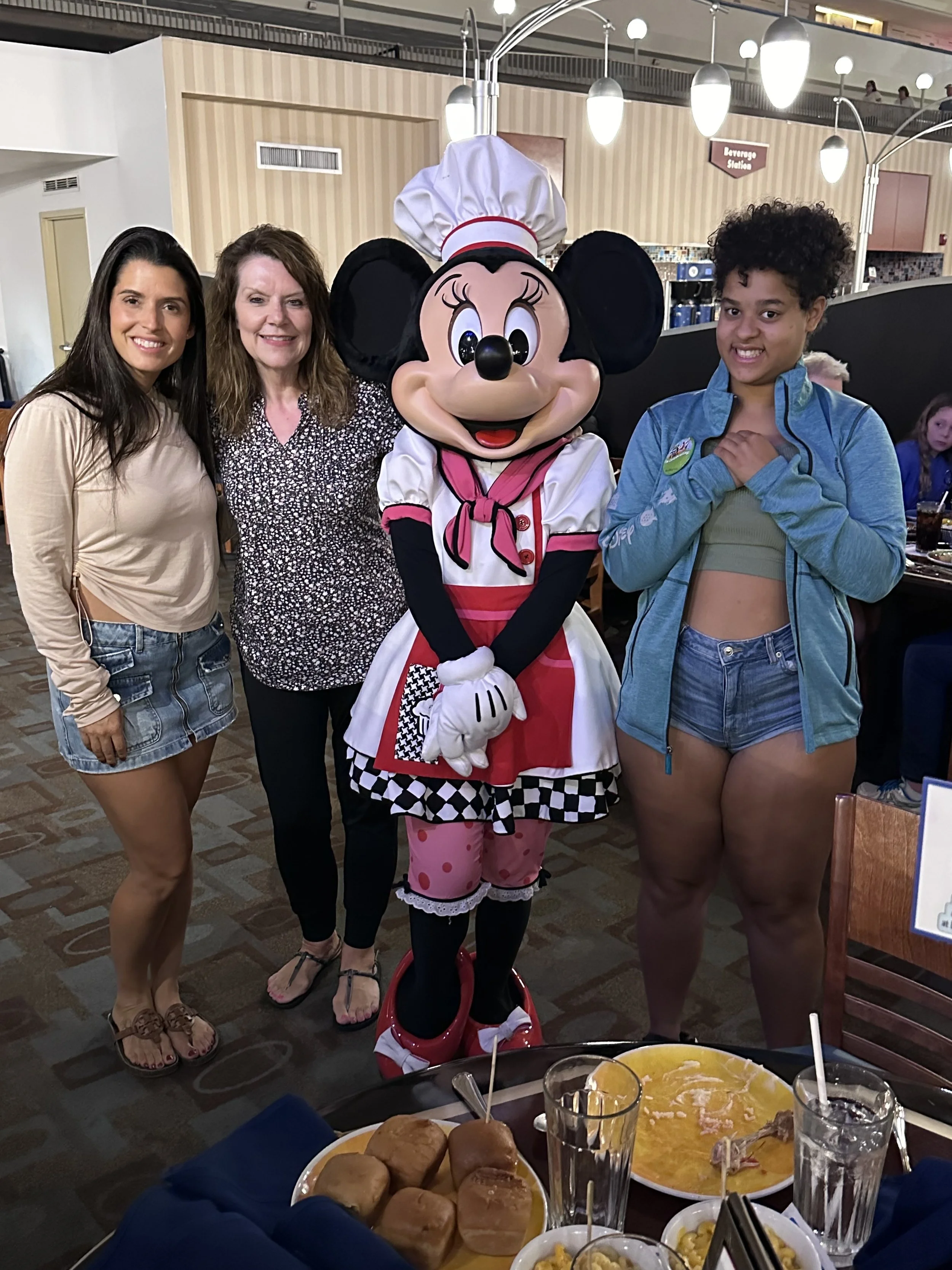 Three women and a person dressed as Minnie Mouse in a chef's outfit posing together in a restaurant, with food and drinks on the table in the foreground.