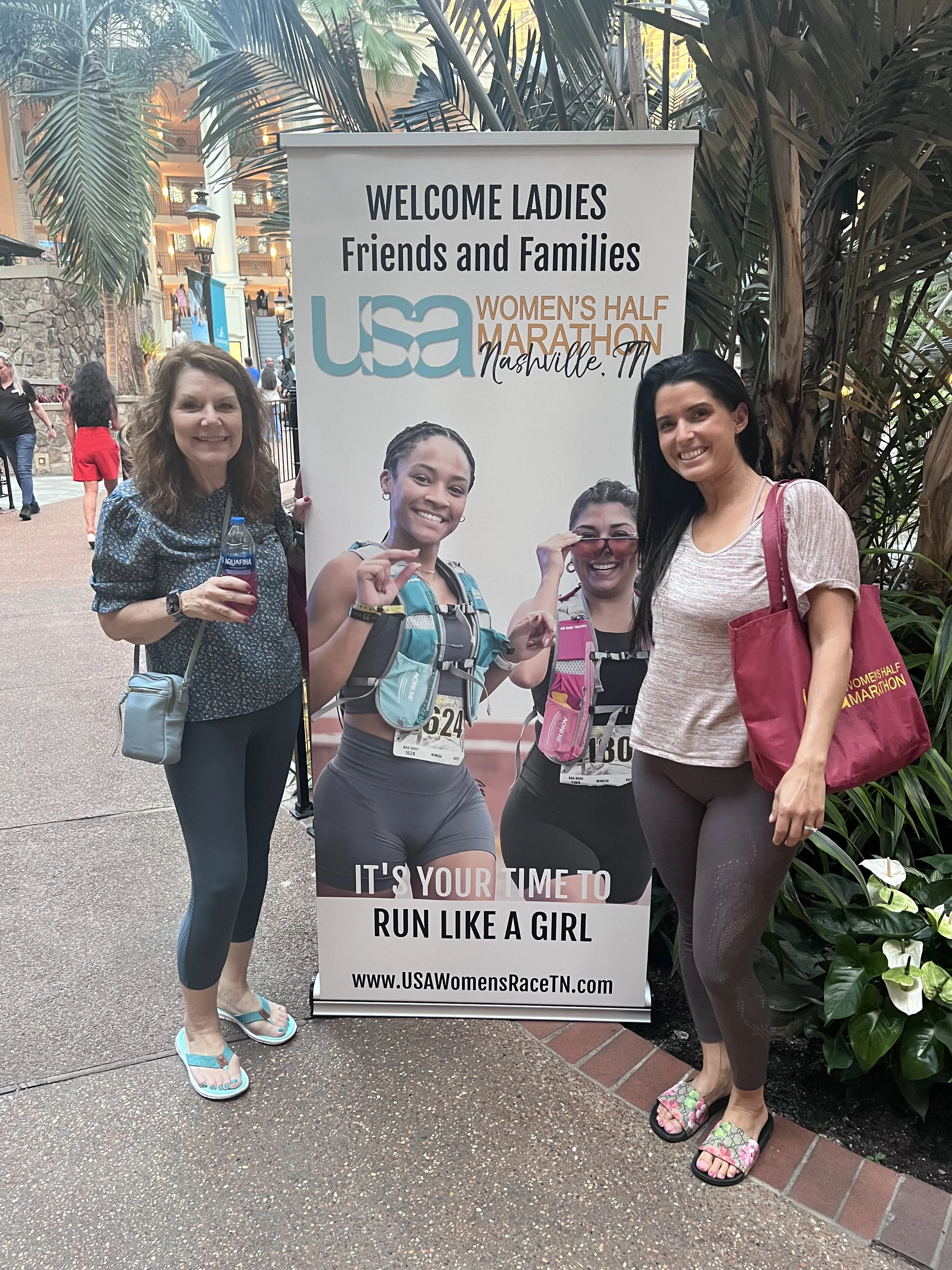 Two women standing next to a promotional banner for the USA Women's Half Marathon in Nashville, Tennessee. The banner features two female runners and the slogan 'It's your time to run like a girl.' The women are smiling and holding hands, one with a