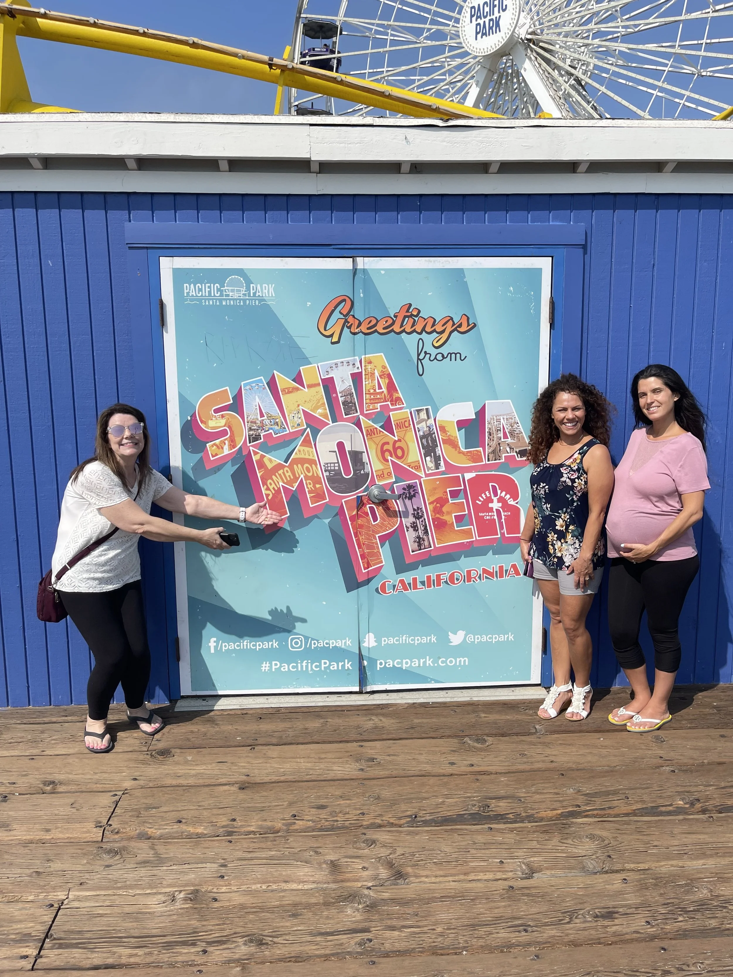 Three women standing in front of a colorful sign that says "Greetings from Santa Monica, California," with a Ferris wheel in the background at Pacific Park on the Santa Monica Pier.
