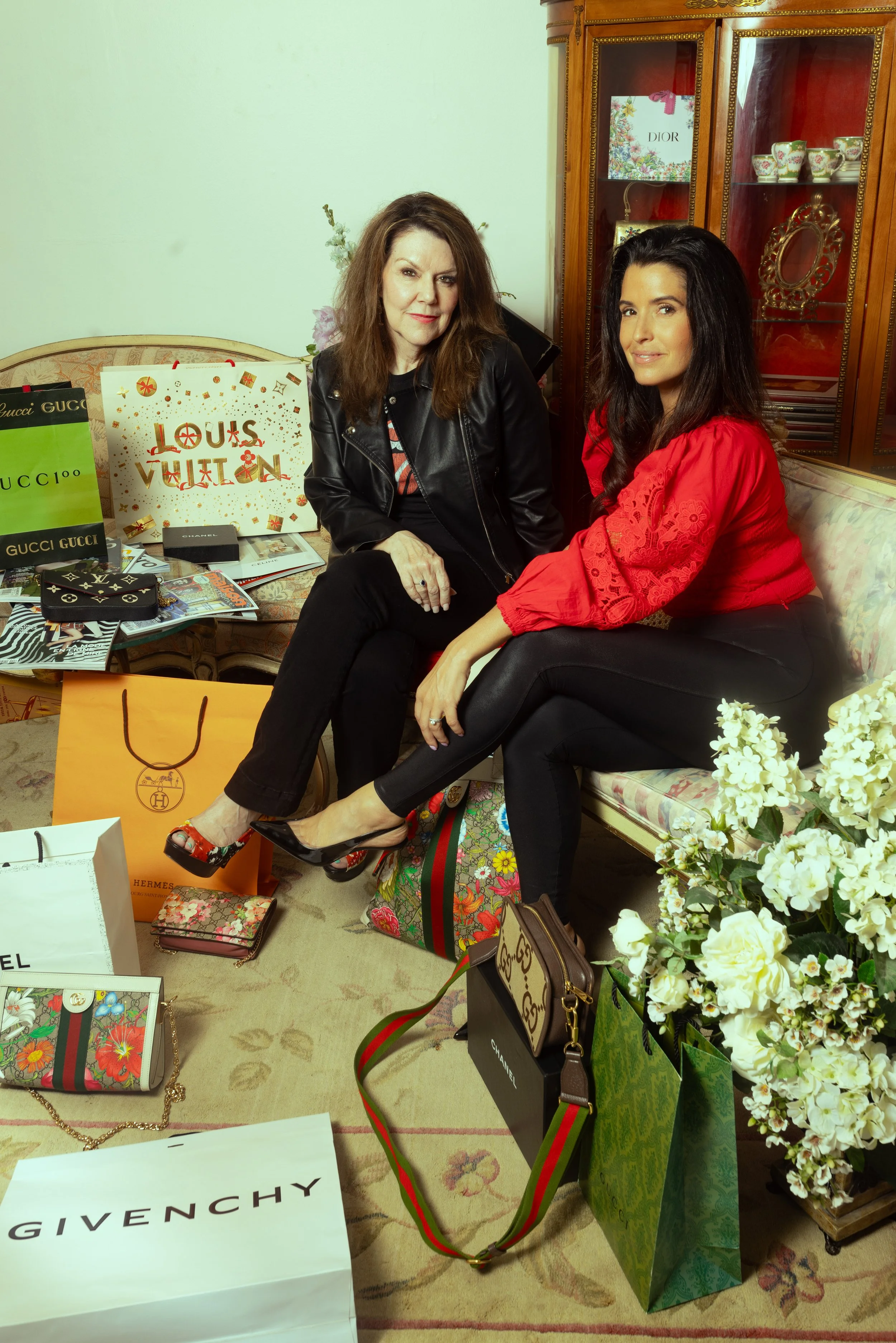 Two women sitting on a floral-patterned sofa surrounded by luxury shopping bags, gift boxes, and accessories, with a background of a wooden display cabinet and white flowers.