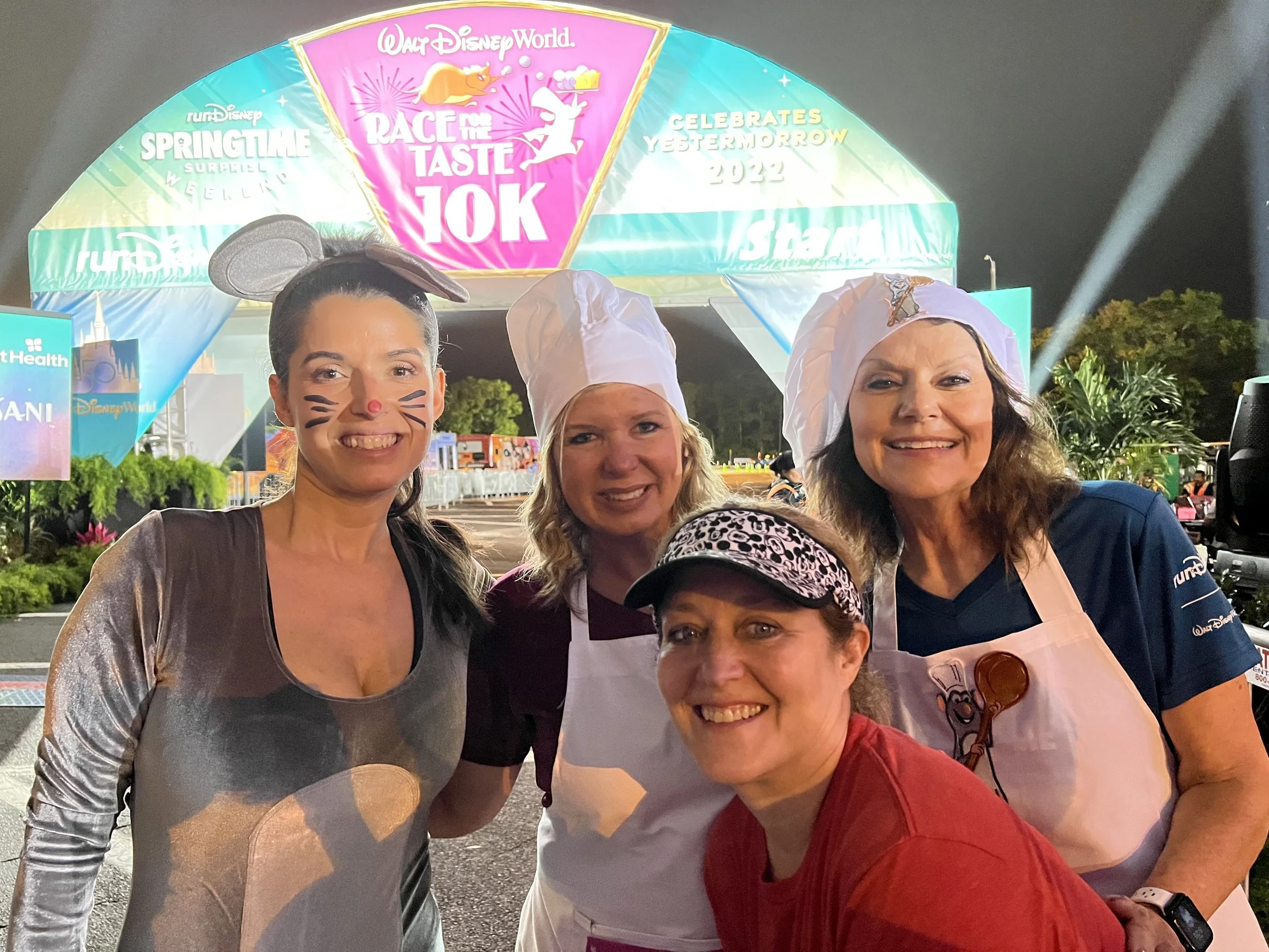 Four women at a night event, smiling, with a Disney-themed arch and colorful banners behind them. One woman is dressed as a mouse with face paint, and two women are wearing chef hats and aprons.