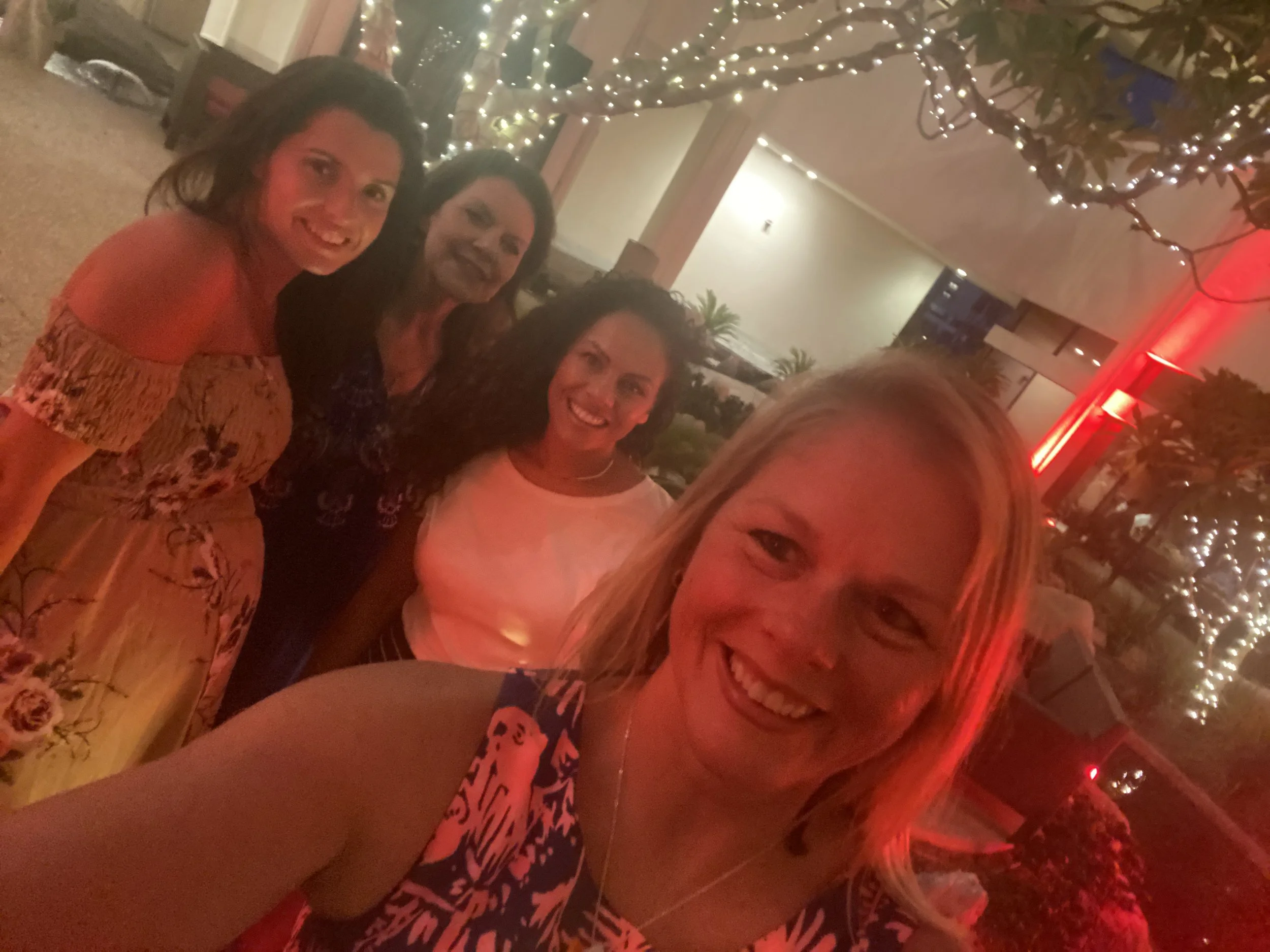 Four women smiling for a group selfie at a dimly lit party or celebration. Decorated with string lights and a tree with lights, indoors with warm lighting.