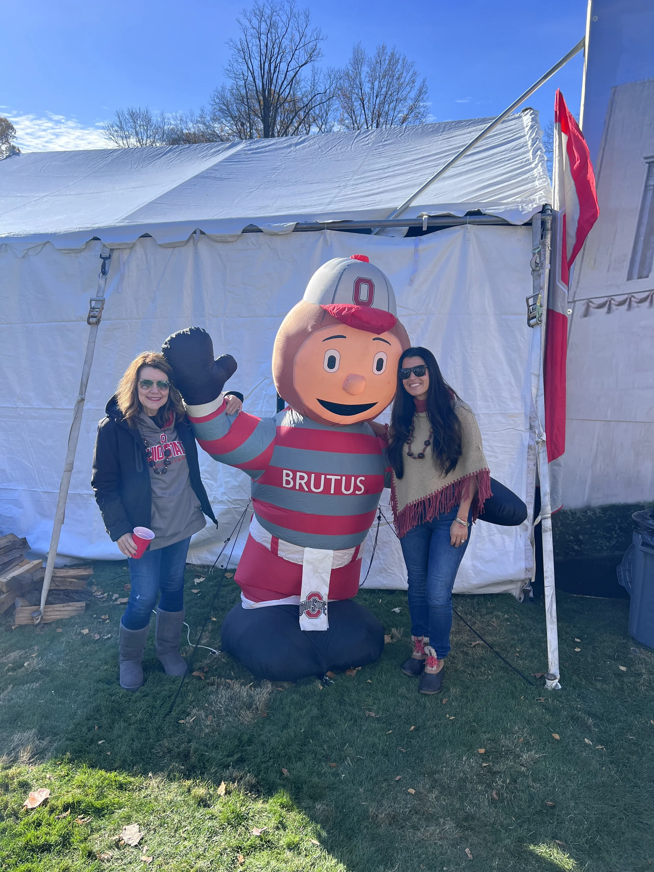 Two women standing next to a large mascot dressed as a football player with Ohio State branding. The women are smiling and waving, with a white tent and blue sky in the background.