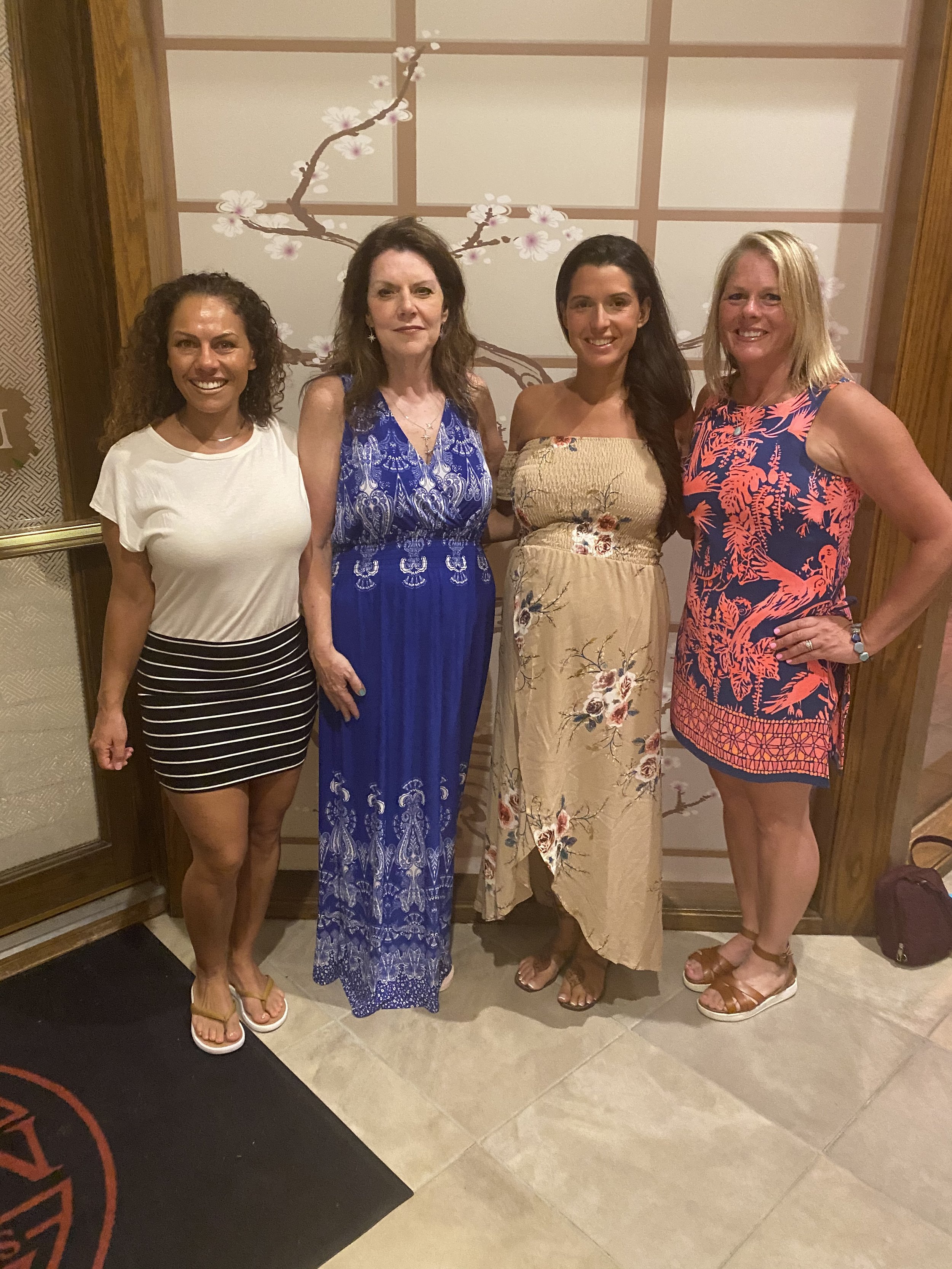 Four women standing together indoors in front of a decorative wall with a branch and blossoms design, posing for a photo.