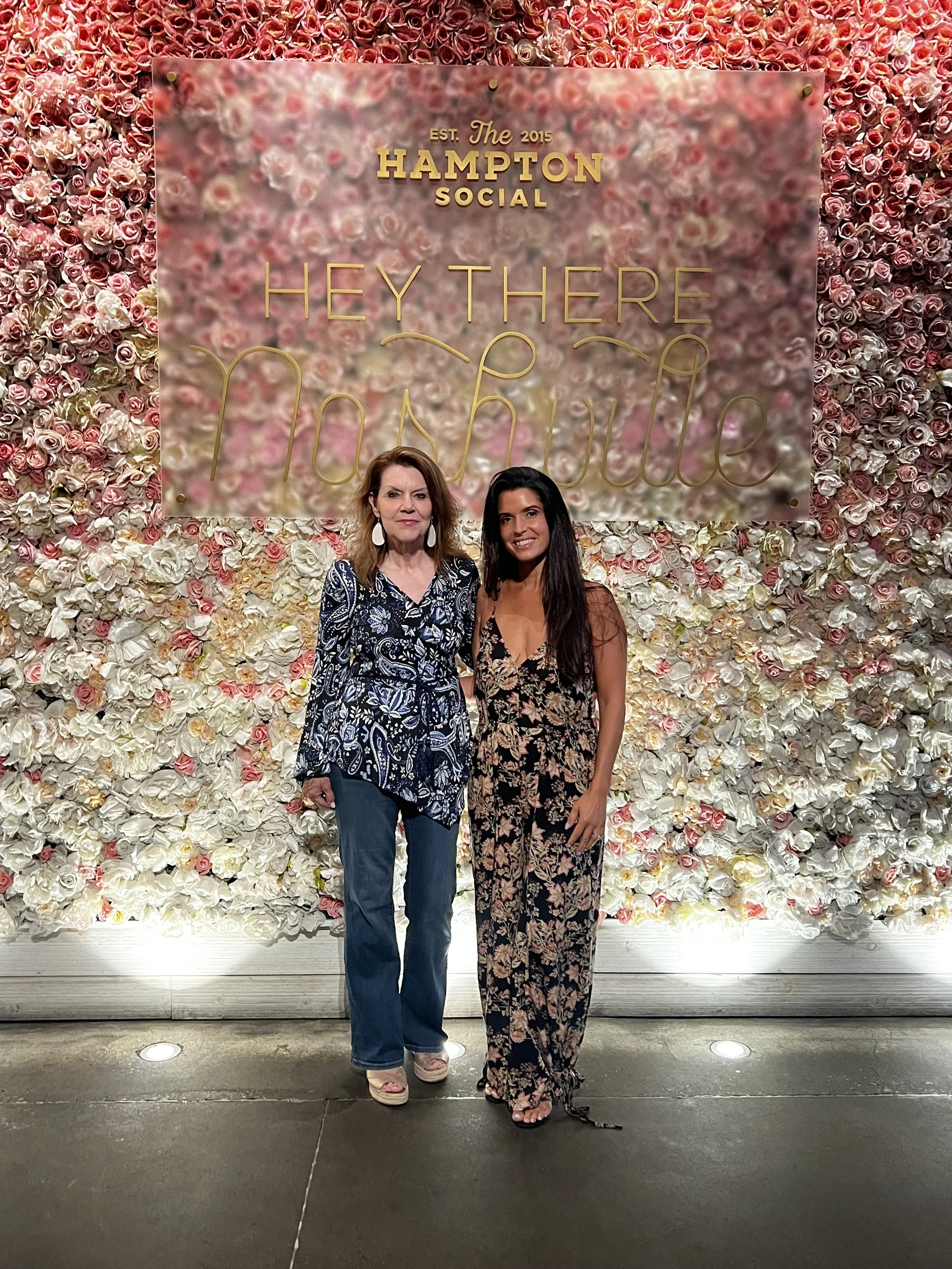 Two women standing in front of a floral backdrop at an event, with one woman wearing a dark floral jumpsuit and the other wearing a blue and white patterned top with jeans. A large sign above them reads, 'Hampton Social' and 'Hey There Beautiful'.