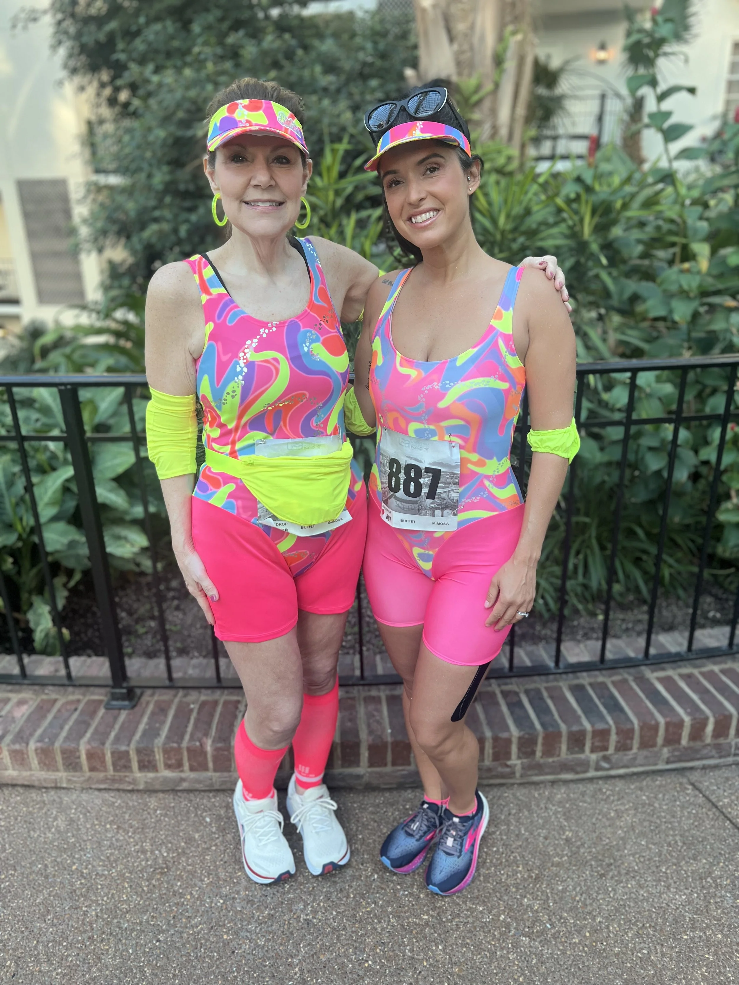 Two women dressed in colorful, patterned athletic wear, standing outside in front of greenery. They are smiling, with their arms around each other, ready for a race or marathon. They both have race bibs on their shorts.