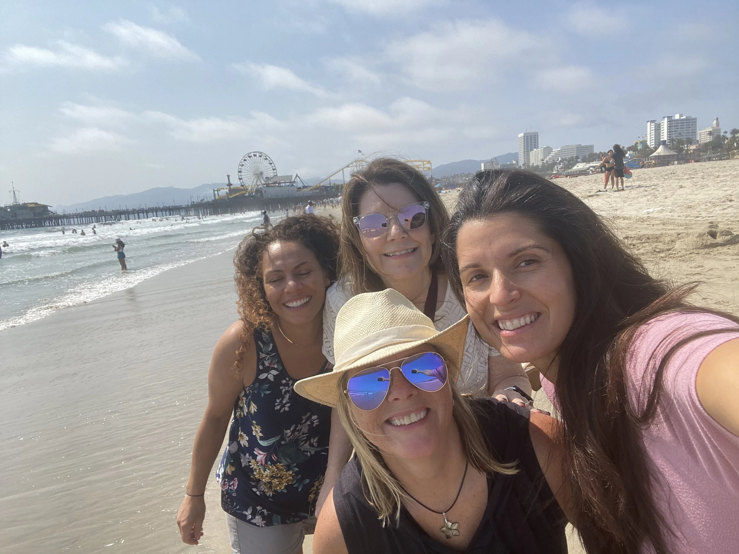 Group of four women taking a selfie on a sandy beach with a pier, ferris wheel, and buildings in the background.