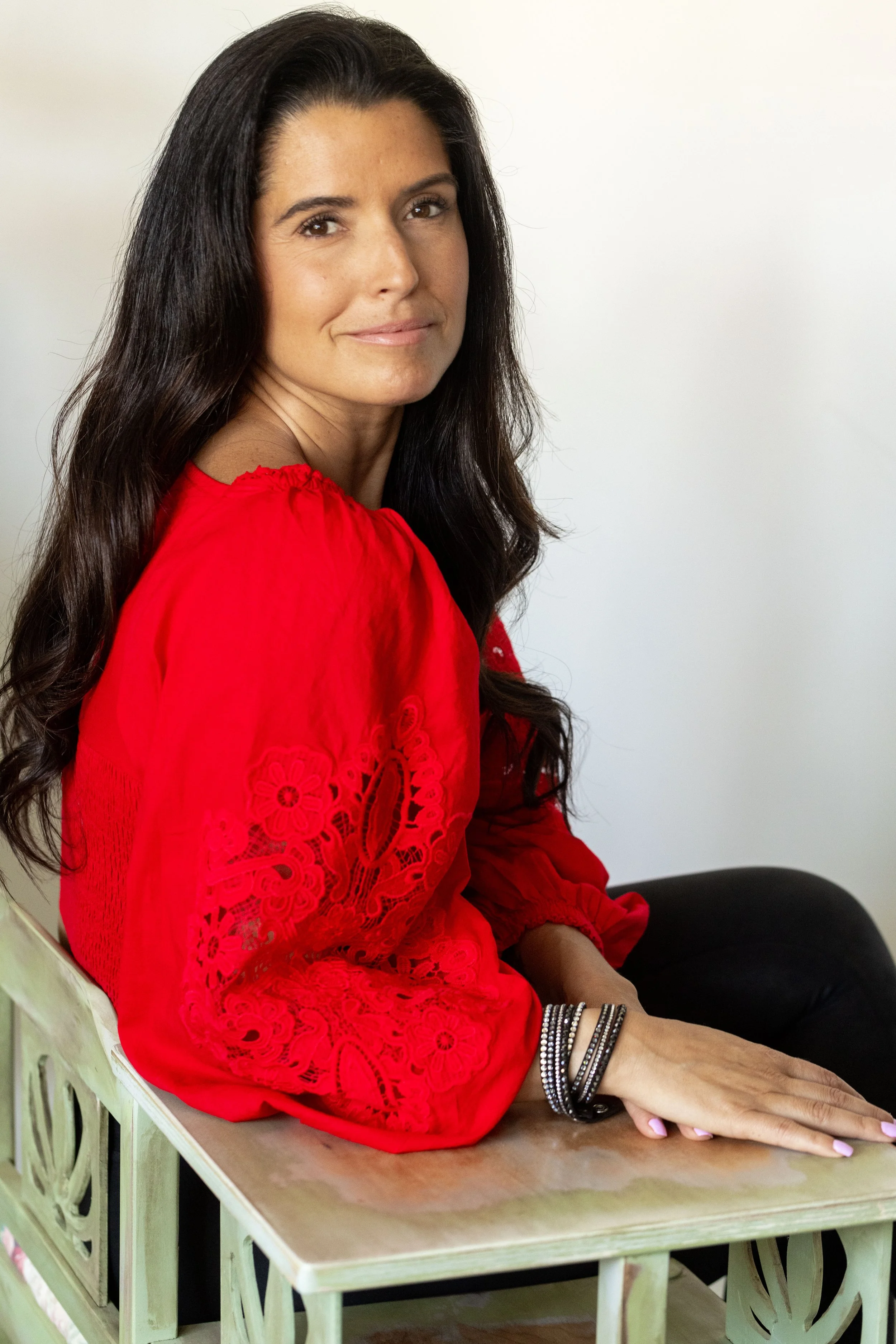 A woman with dark wavy hair sitting at a wooden table, wearing a red blouse with embroidered floral patterns on the sleeves, with her hands resting on the table and looking at the camera.