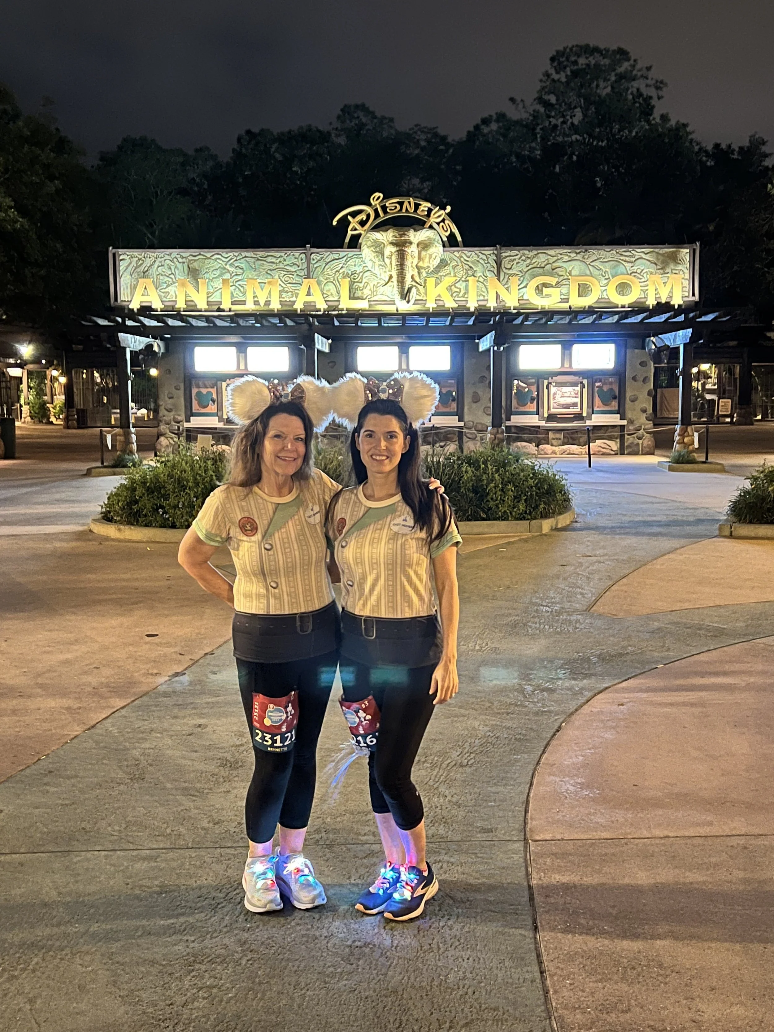 Two women wearing Disney Animal Kingdom themed shirts and mouse ear headbands with lights, standing together in front of the Animal Kingdom entrance at night.