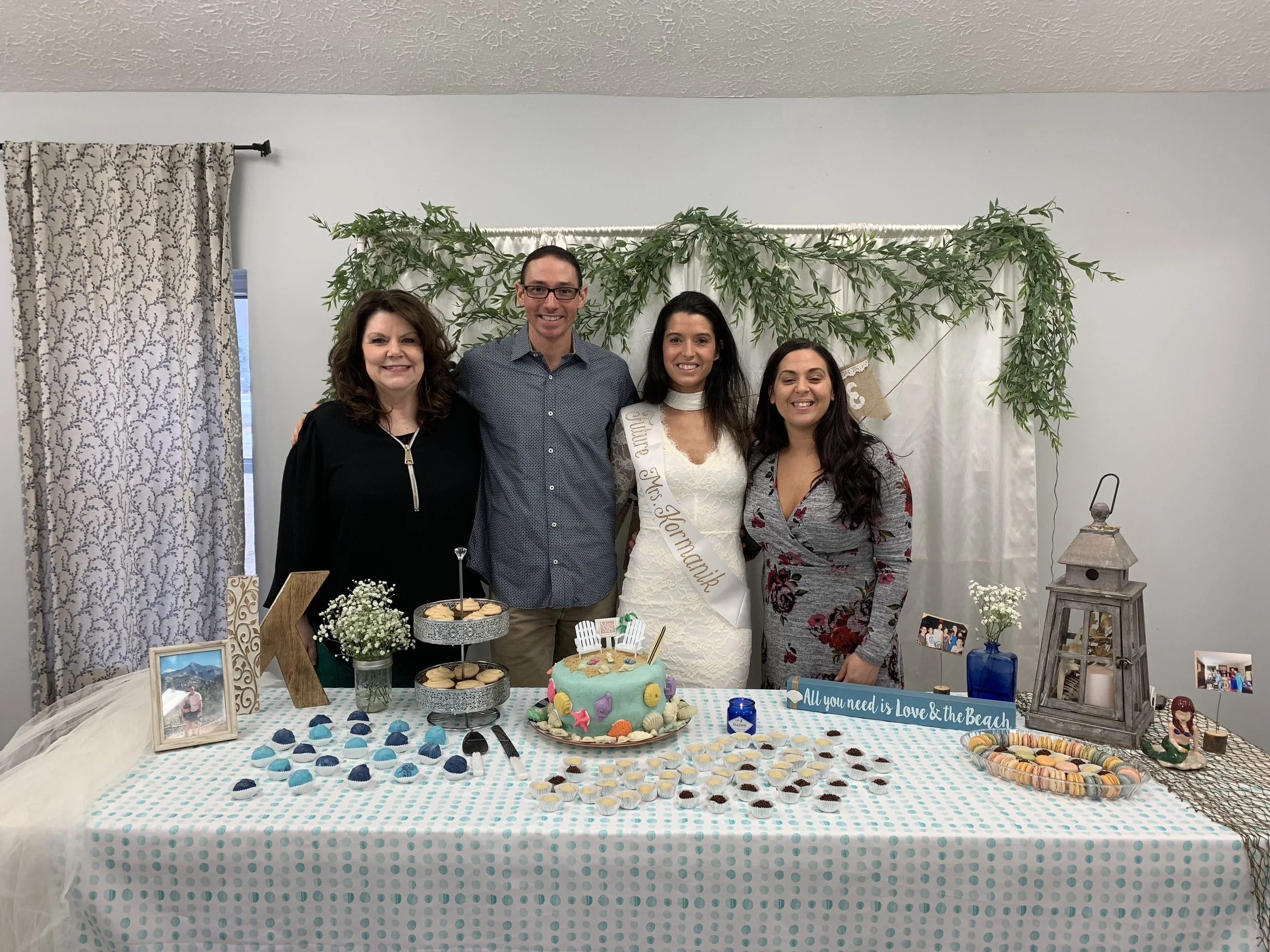 Group of four people celebrating at a table with desserts, a cake, and decorations in a room with white walls and a leafy green backdrop.
