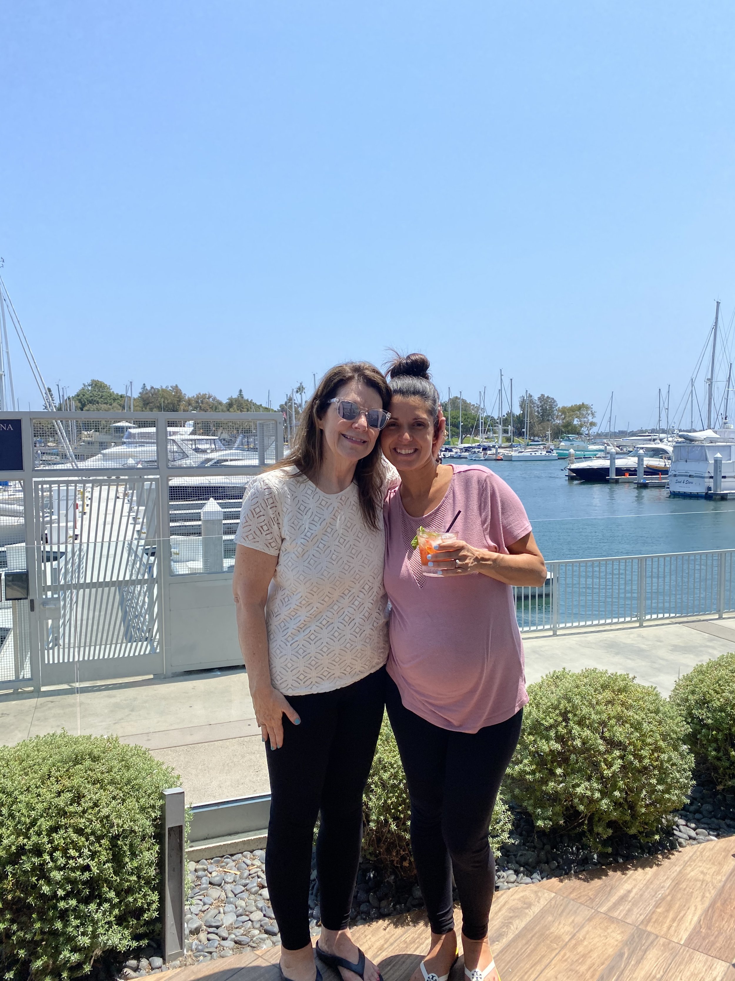 Two women standing close together near a marina, smiling, with boats and clear blue sky in the background. One woman is wearing sunglasses and a white top, the other is holding a drink and wearing a pink top.