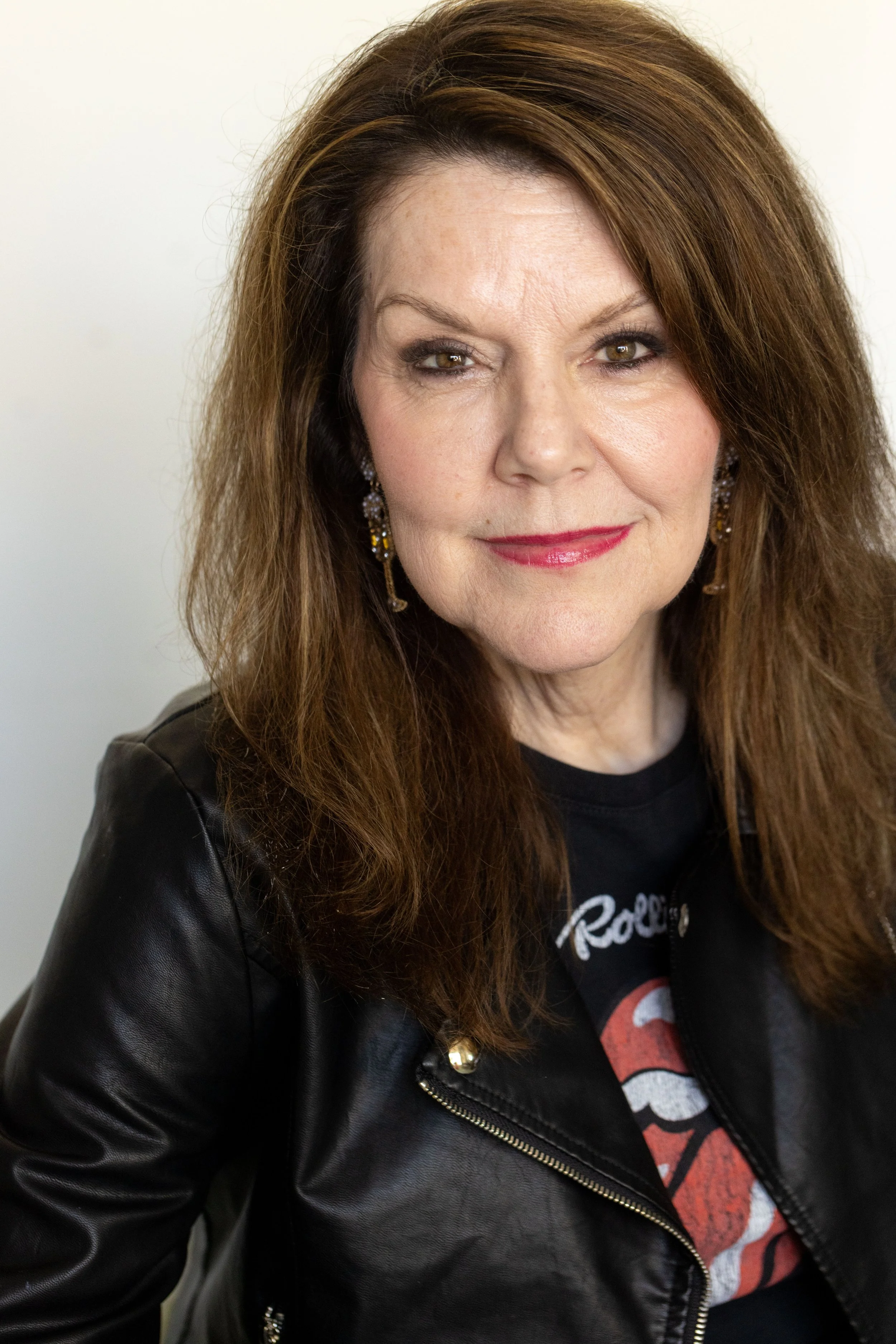 A woman with long brown hair, wearing earrings, a black leather jacket, and a Rolling Stones t-shirt, smiling at the camera against a plain background.