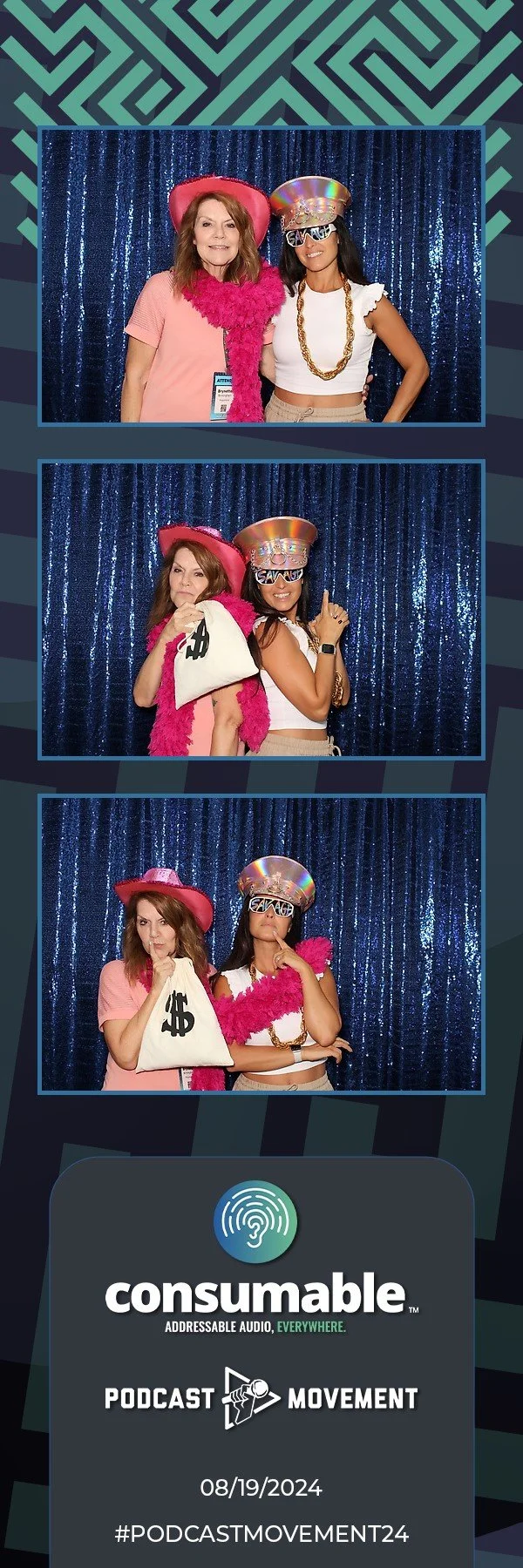 Three women at a photo booth dressed in colorful, quirky costumes posing in front of a blue sequin backdrop. The first woman wears a pink hat, pink feather boa, and pink shirt. The second woman wears a shiny metallic hat, large sunglasses, and a whit
