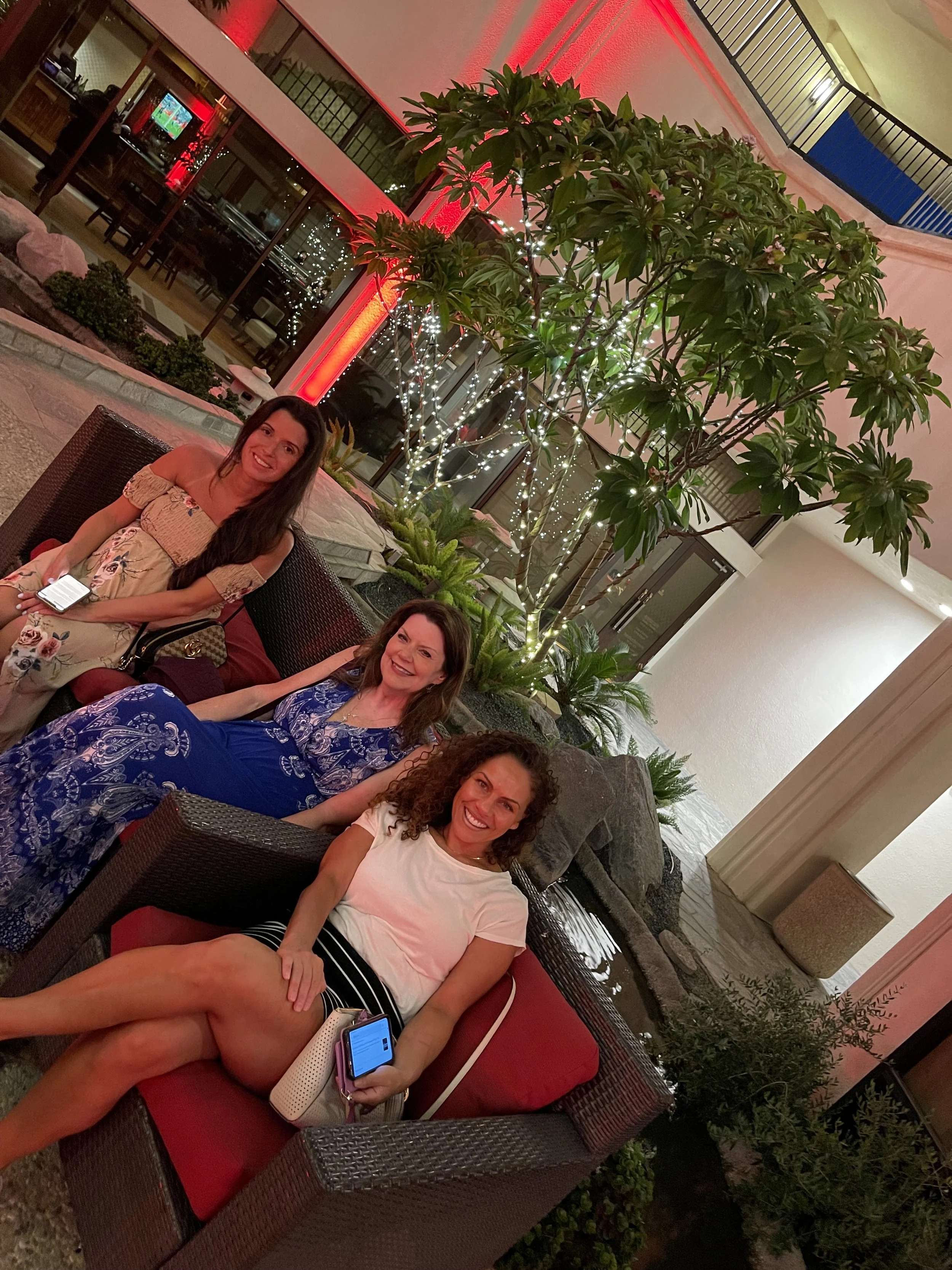 Three women sit on outdoor wicker furniture, smiling, in front of a large plant with string lights, with a building and glass windows in the background.