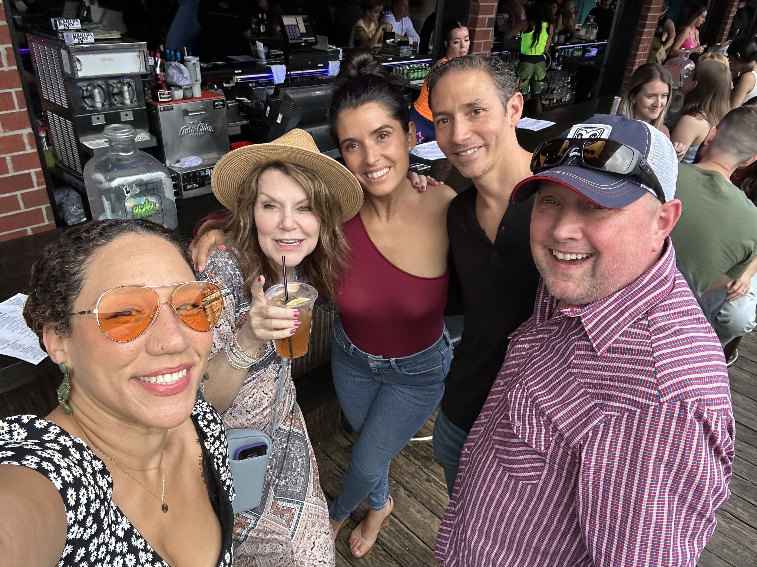 Group of six friends taking a selfie at an outdoor bar or restaurant, smiling and enjoying drinks, with a brick wall and crowded bar in the background.
